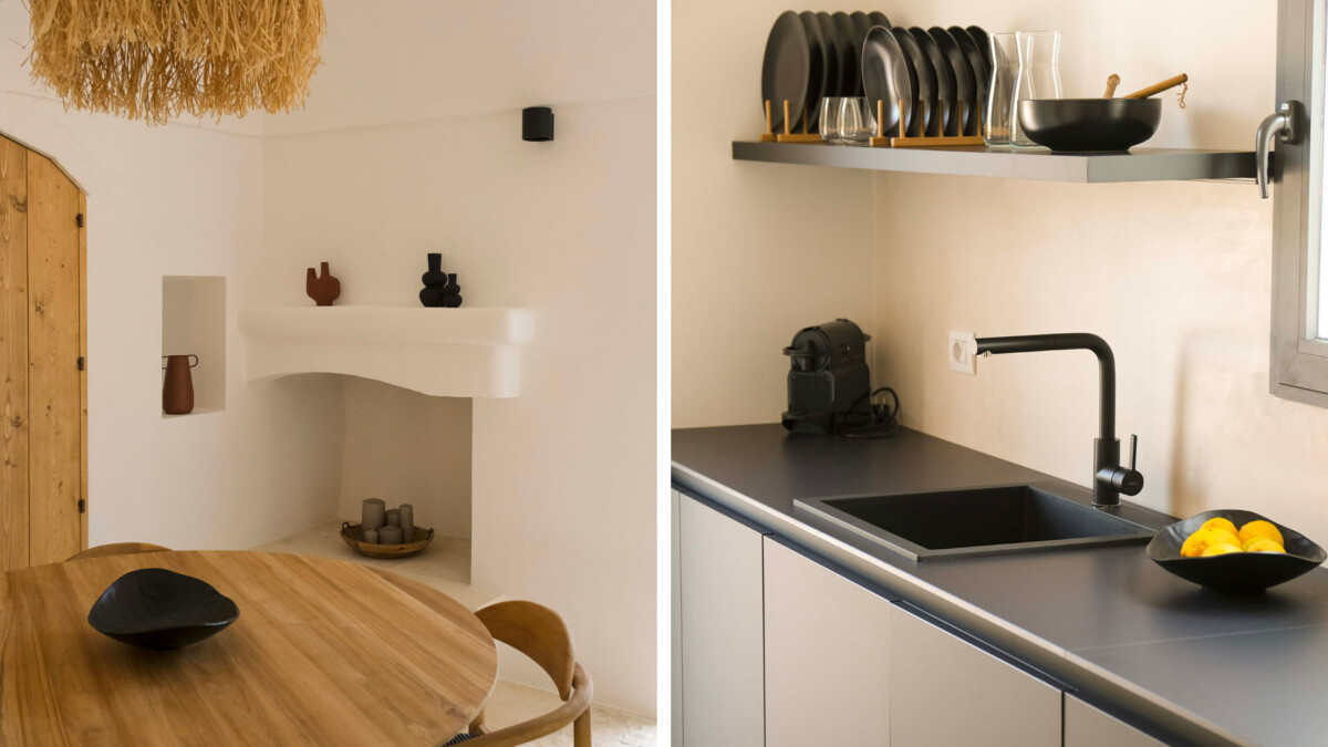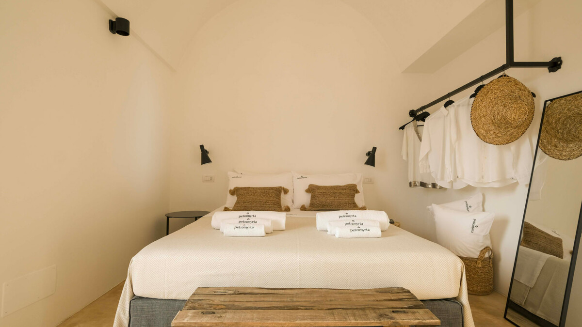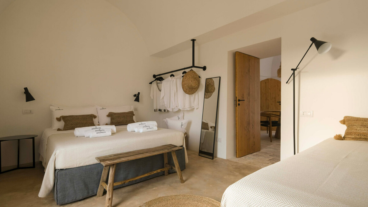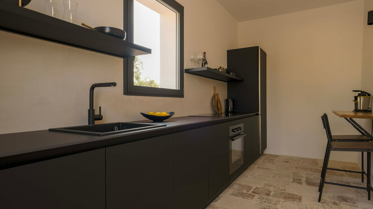 L’intérieur est un véritable hommage à l’architecture apulienne et au design italien contemporain. En entrant, vous serez accueilli par une ambiance chaleureuse et intime, caractérisée par des tons doux et profonds. La maison comprend un salon spacieux avec des canapés confortables et des éléments de décoration traditionnels mêlés à du mobilier design italien. La salle à manger, pouvant accueillir jusqu’à cinq personnes, est un espace convivial parfait pour des repas en famille ou entre amis. La cuisine, entièrement équipée, est un joyau de design alliant modernité et matériaux traditionnels, offrant tous les appareils nécessaires pour concocter des repas délicieux.