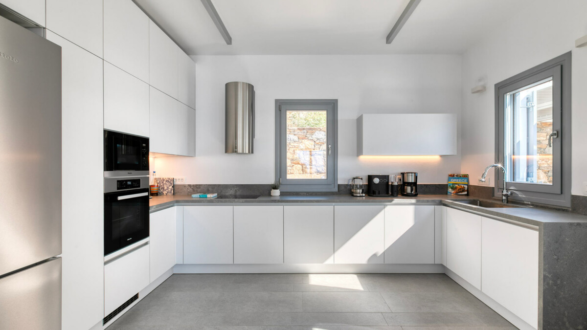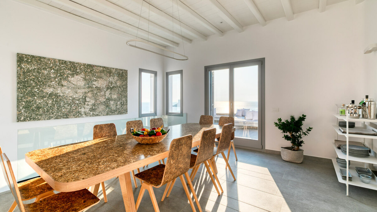 La maison comprend 5 chambres spacieuses et climatisées, toutes dotées d’une salle de bain privative. La suite principale de l’étage supérieur offre un lit super king-size, un ventilateur de plafond et une vue magnifique sur la mer et la piscine. Le niveau inférieur abrite 3 chambres doubles avec des lits king-size et vue sur la mer et la piscine, une chambre double (ou lits jumeaux).