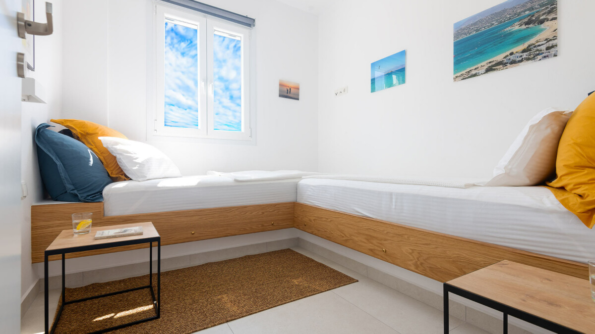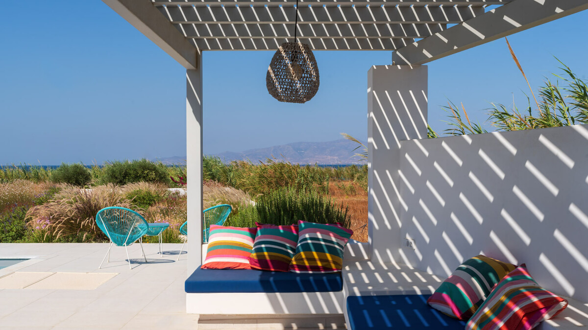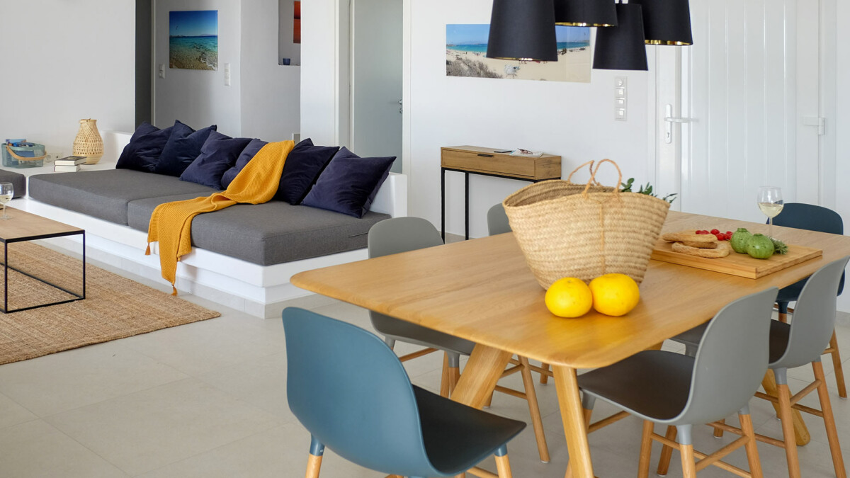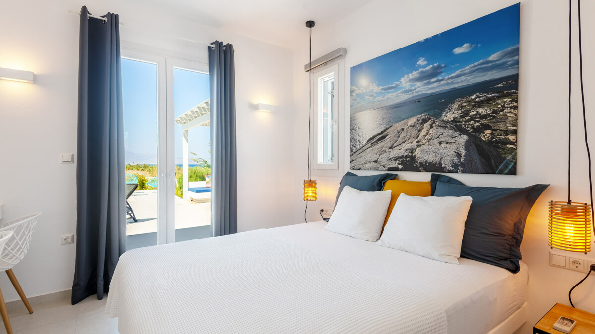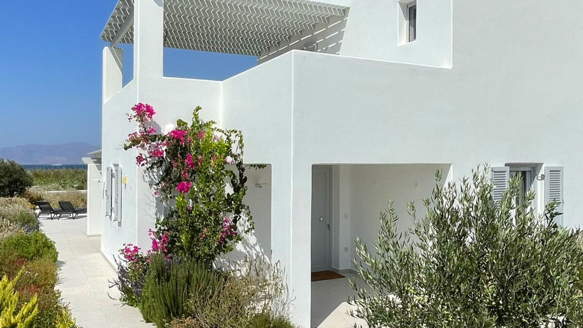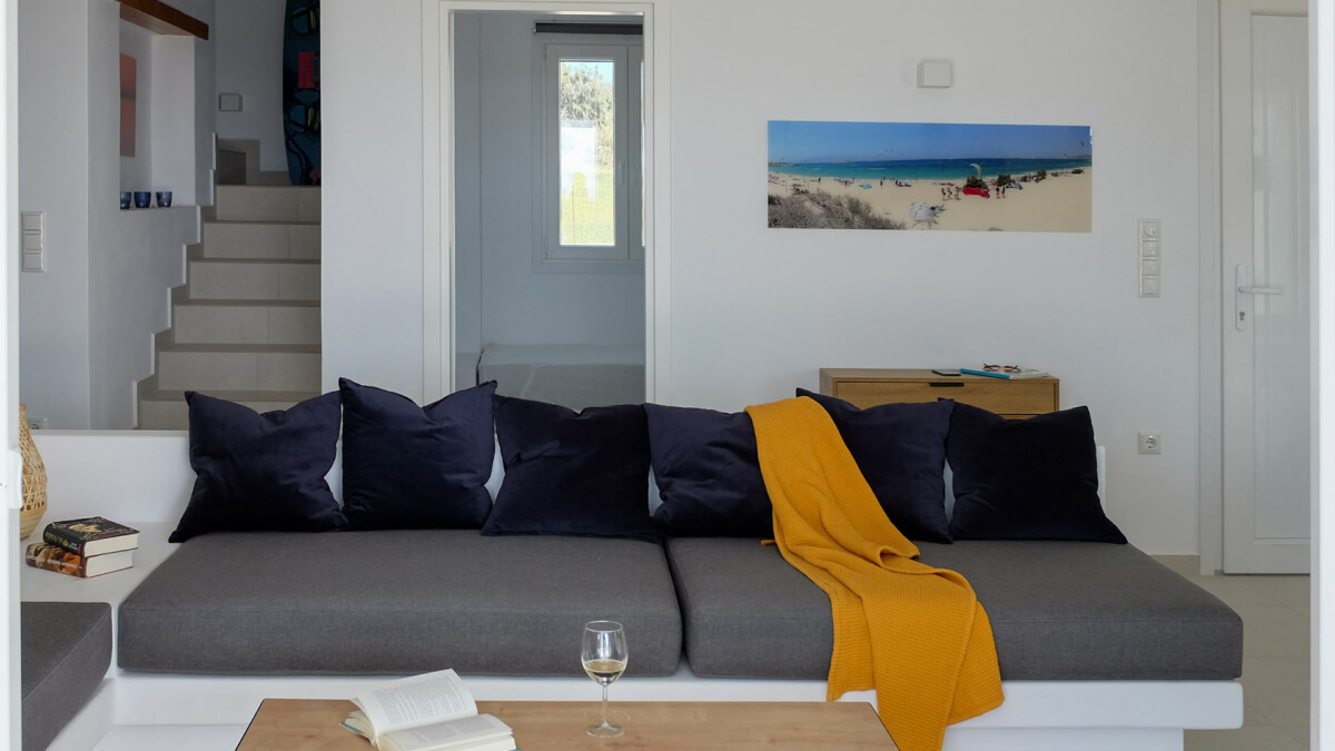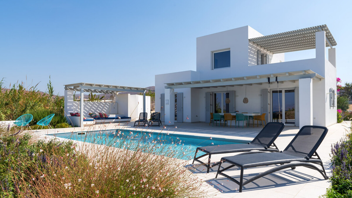 À deux minutes à pied de la plage, les extérieurs promettent des vacances idylliques dans le véritable style des îles grecques. La vaste terrasse principale est conçue pour bronzer paisiblement près de la piscine privée (de 7 x 3m – Profondeur : de 1.2 à 1.40m). Une salle à manger extérieure sous une pergola ombragée offre l’endroit idéal pour profiter de repas en plein air, tandis que l’espace lounge confortable invite à la relaxation, face aux couchers de soleil spectaculaires sur la mer Égée cristalline.
