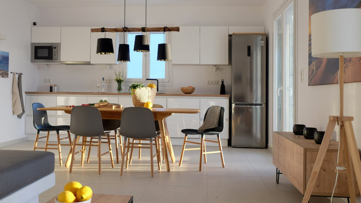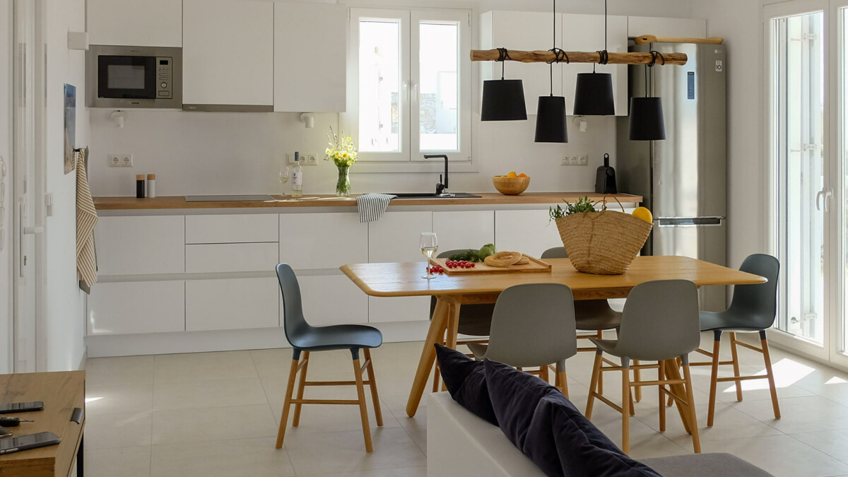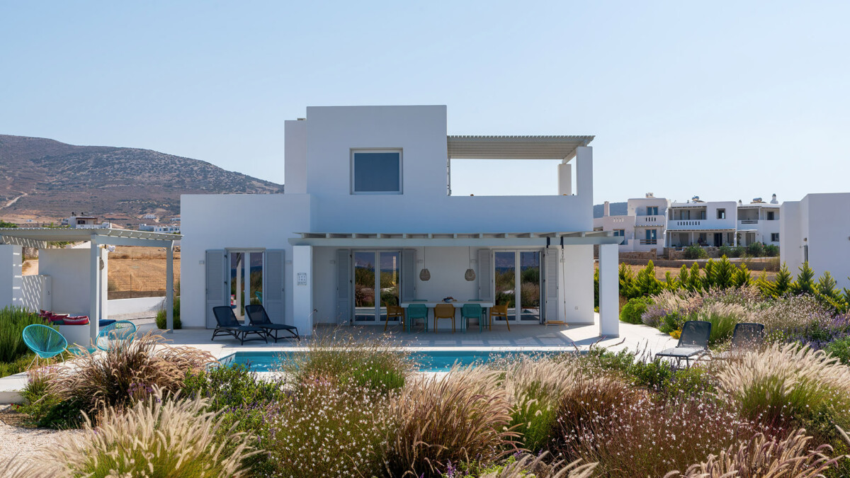 La propriété affiche un style moderne-cycladique, où les espaces de vie élégants se composent de trois chambres, deux salles de bains dotées de douches à effet pluie, et une charmante pièce de vie. La cuisine, bien équipée, s’ouvre sur le salon et l’espace salle à manger, créant un espace harmonieux pour des moments conviviaux en famille ou entre amis.