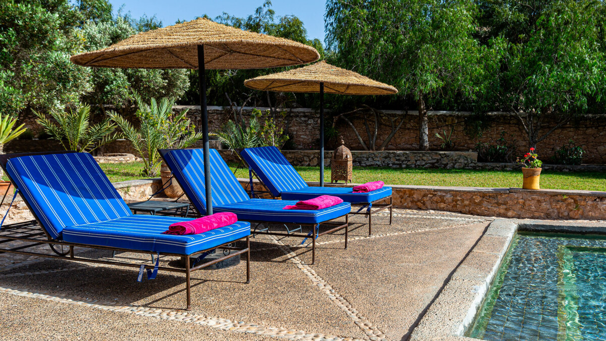 Parfaite pour les couples, les familles, les sportifs et les rêveurs, elle peut accueillir 8 adultes et 4 enfants. Vous apprécierez son calme, ses espaces extérieurs, sa piscine chauffée et sa proximité d’Agadir et de Marrakech (2h30). A 4 km, vous accédez à une plage déserte de sable blond bordée d’un cordon de dunes par une piste carrossable serpentant entre les genévriers. Sur 4000 m2 de jardin clos et autour d’une piscine de 10m x 4m chauffée (d’avril à fin octobre) , vous pourrez admirer cactus, bougainvilliers, jasmin, oliviers, eucalyptus, arganiers.