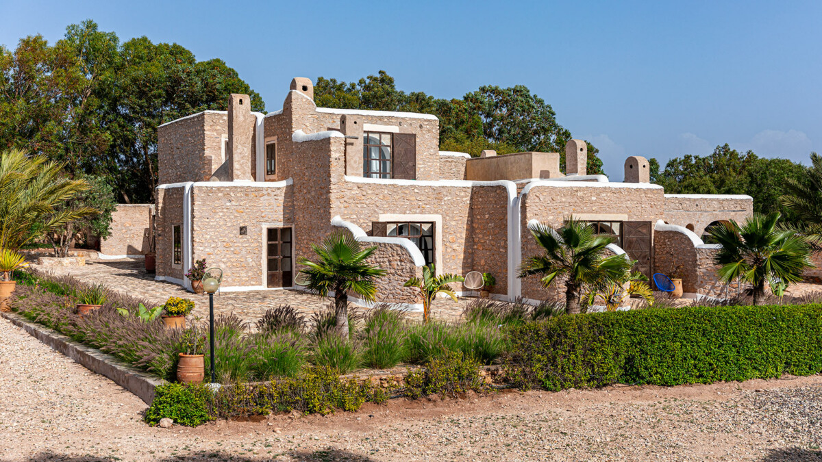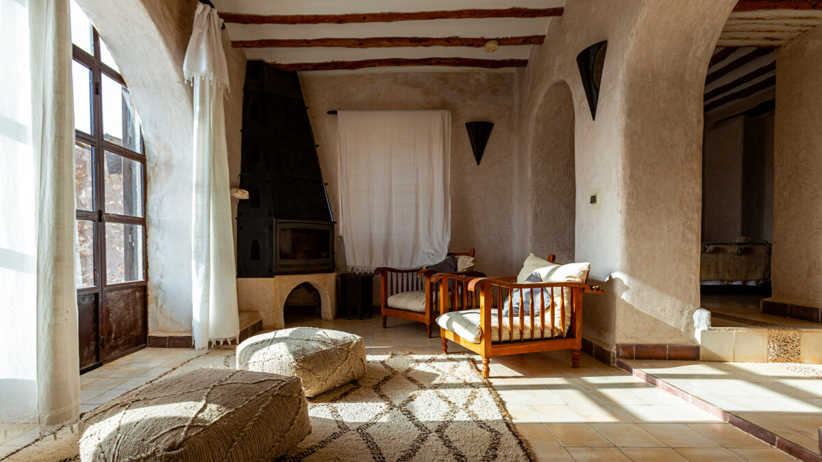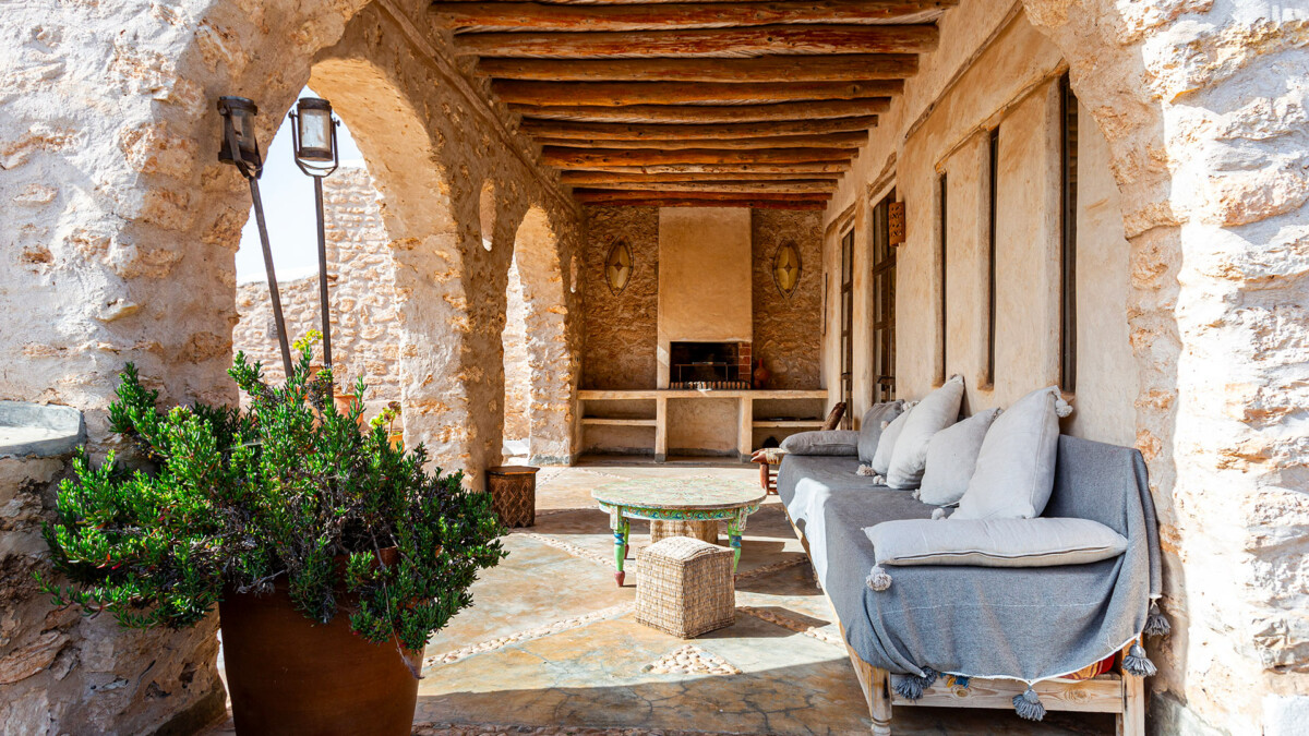 La villa offre une architecture inspirée des constructions traditionnelles du Sud Marocain. Dessinée par un architecte marocain, cette villa de 300 m² est conçue comme une petite medina avec ses ruelles, ses patios et ses nombreux salons et terrasses. Entièrement construite en pierres massives, avec des poutres d’eucalyptus, des plafonds en bambou et du tadelakt, elle offre une atmosphère authentique et chaleureuse. La décoration intérieure est également unique, avec des pièces authentiques telles que des bronzes et des poteries.