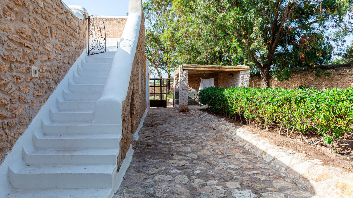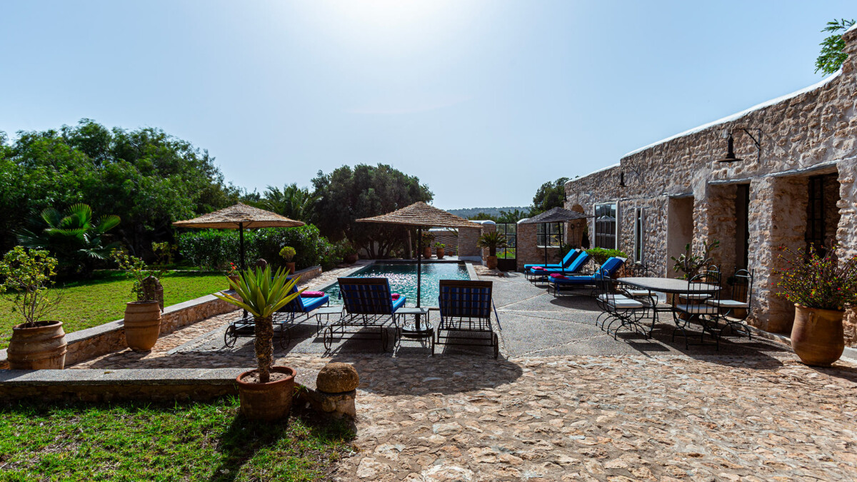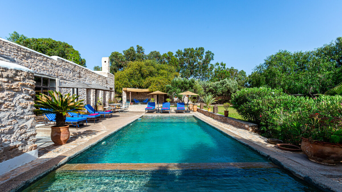 Les extérieurs de la Villa Agouni sont tout aussi charmants, avec une belle piscine (10x4m) et sa terrasse exposée au sud, offrant une vue magnifique sur le jardin arboré de 4000 m². Le jardin est un véritable paradis floral, avec des fleurs et des arbres qui s’épanouissent toute l’année grâce au climat exceptionnel d’Essaouira. Vous pourrez vous détendre à l’ombre des mimosas et des poivriers, tandis que les eucalyptus protègent les oliviers et les arganiers emblématiques de la région.