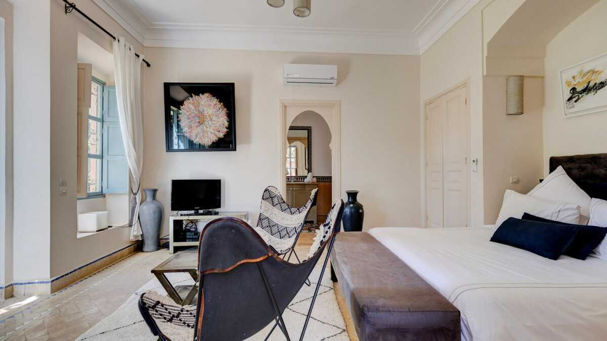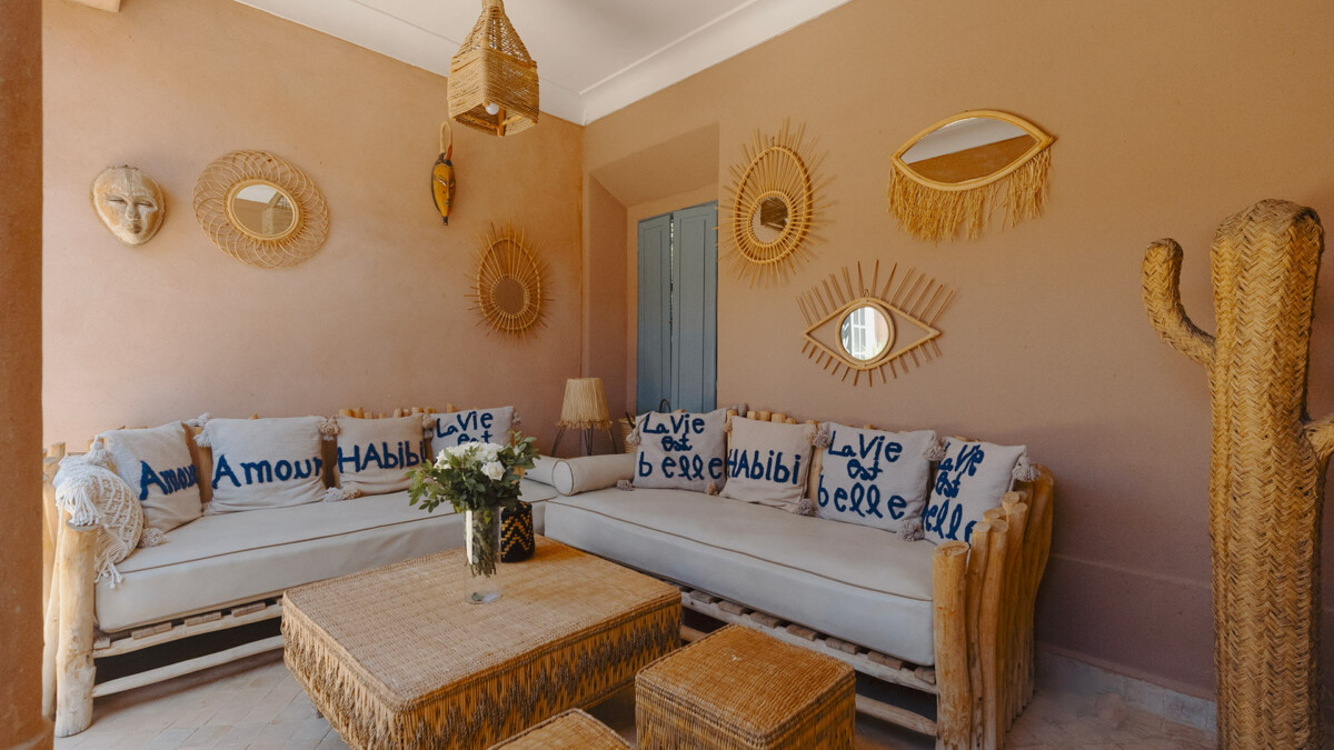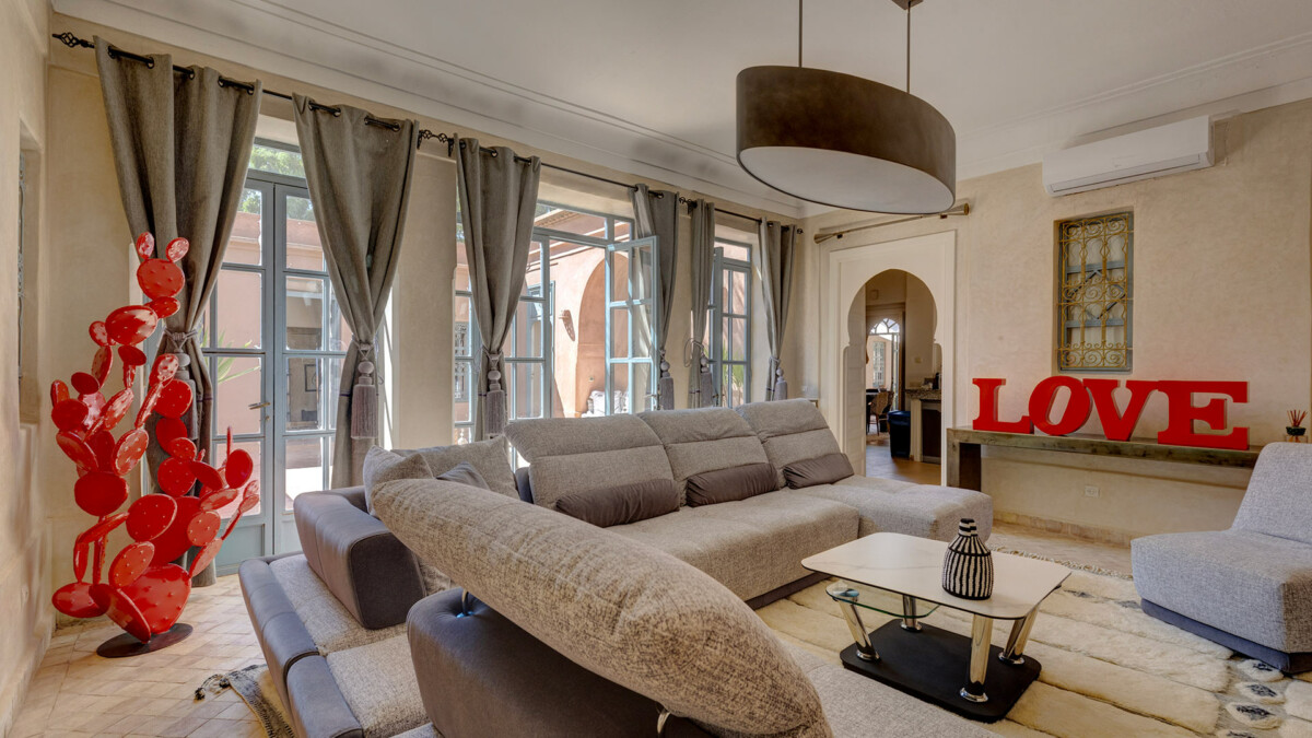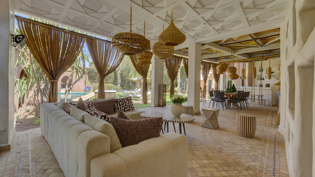 Les intérieurs incarnent une harmonie parfaite entre le style traditionnel marocain et l’art contemporain. Le salon spacieux et lumineux s’ouvre sur un grand patio, permettant une transition fluide entre l’intérieur et l’extérieur.