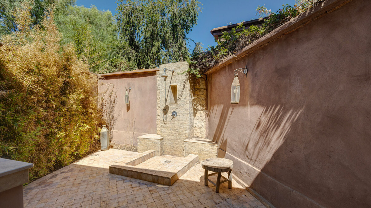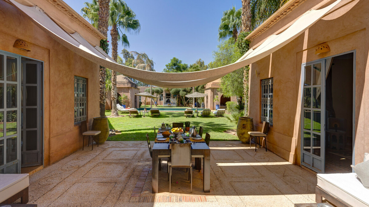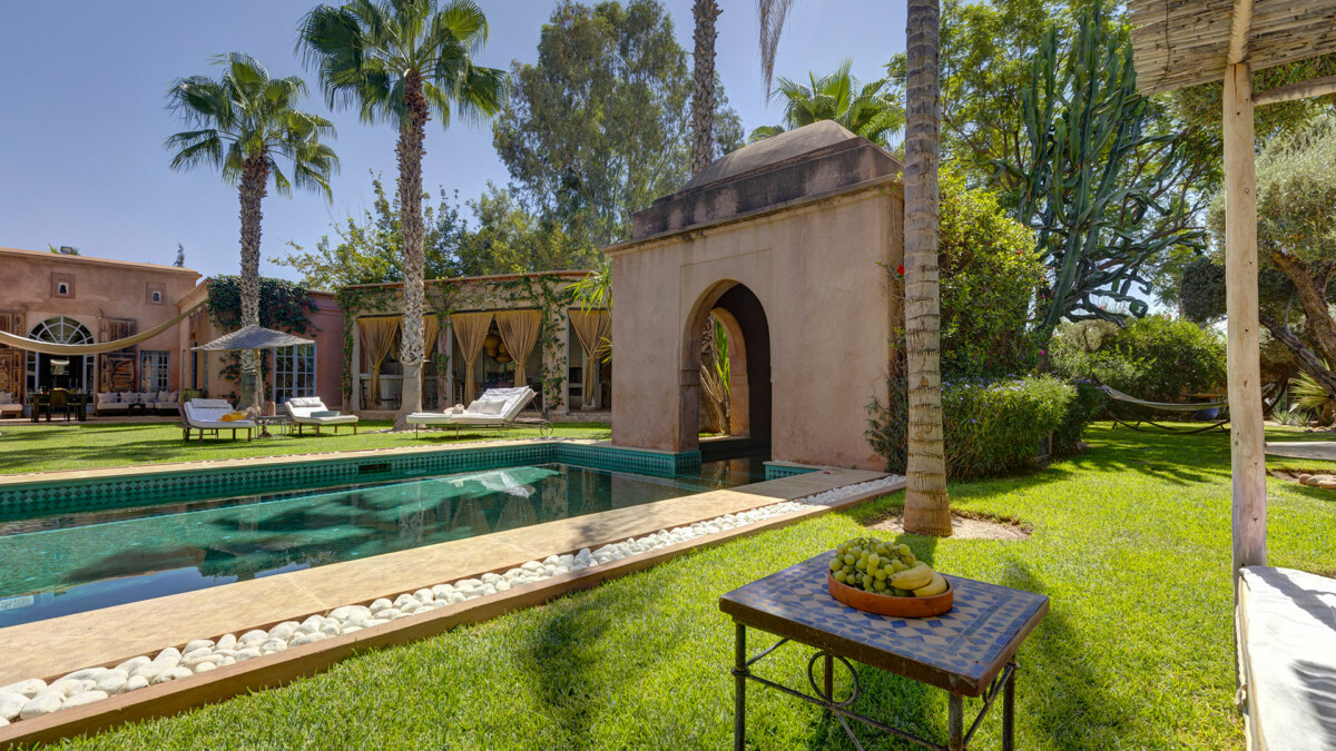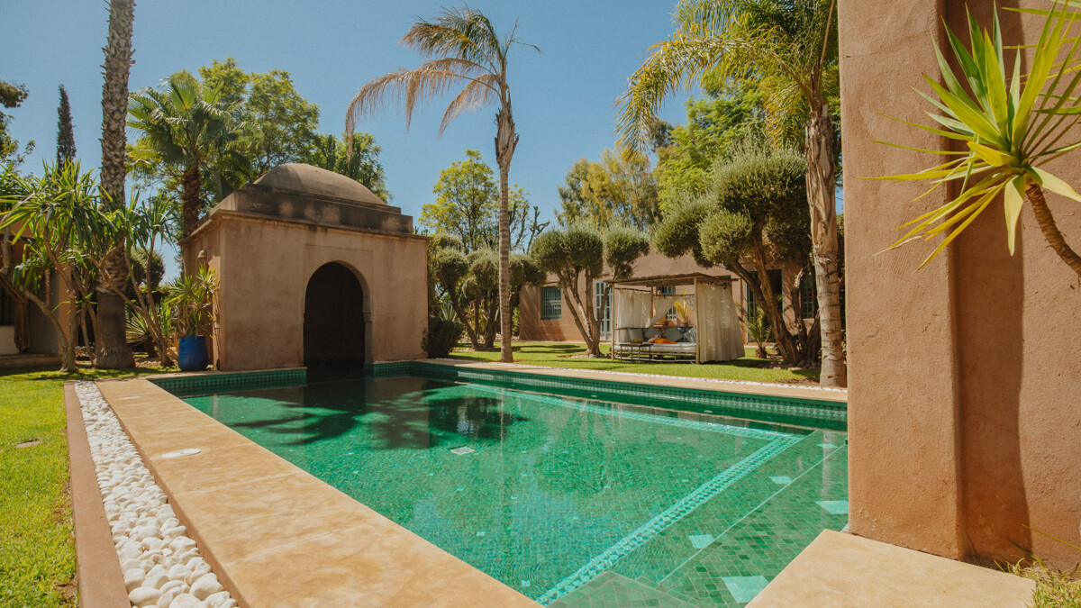 Immergez-vous dans le cadre enchanteur du jardin paysager luxuriant, où une piscine pouvant être chauffée (de 11 x 5m – Profondeur : 1.5m) vous attend pour des moments de détente aquatiques. Autour de la piscine, les pavillons ombragés, les beds et les hamacs offrent des espaces intimes pour se prélasser sous le soleil marocain. La terrasse ombragée, le bar extérieur et le salon d’été invitent quant à eux à la convivialité, que ce soit pour savourer un verre rafraîchissant ou partager une soirée en toute tranquillité. Vous pourrez également profiter d’une douche extérieure.