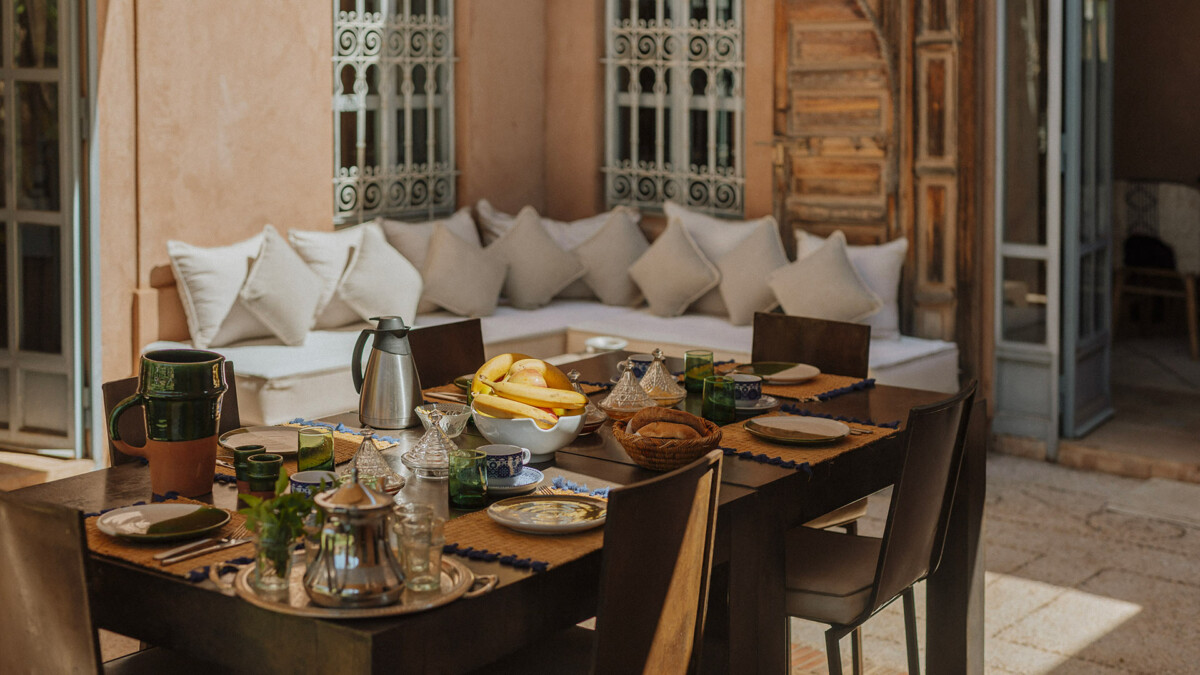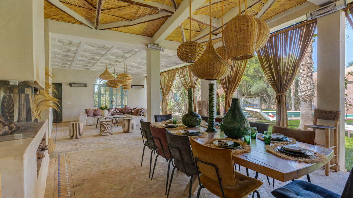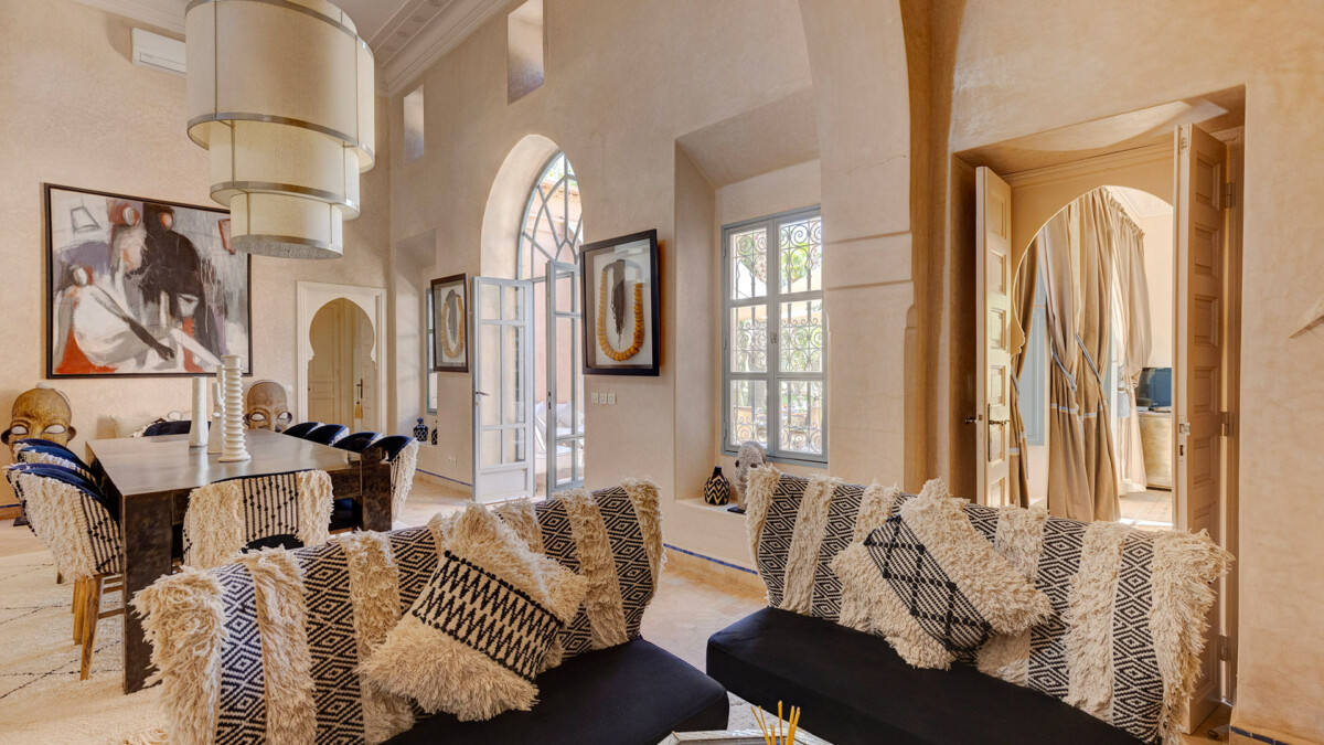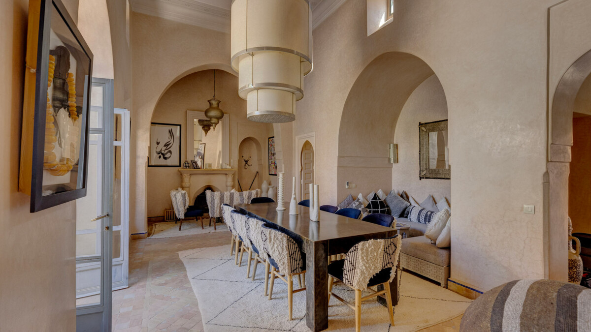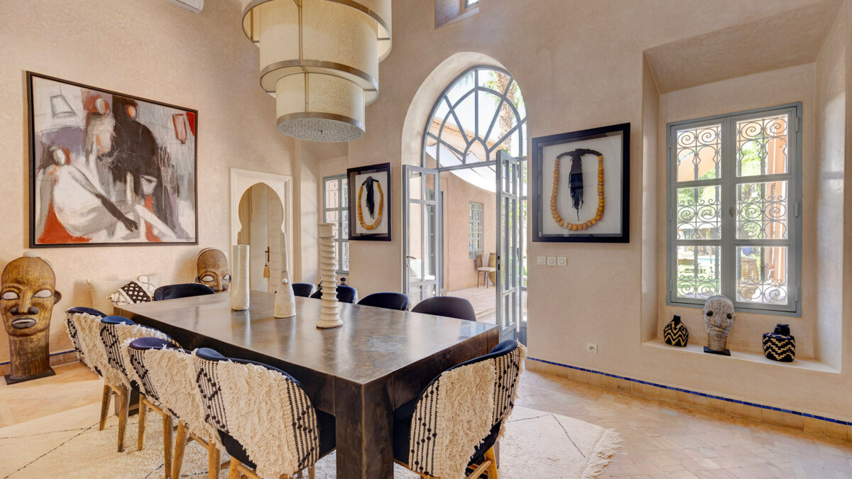 Les espaces de vie sont décorés avec goût, intégrant des détails architecturaux marocains à des sculptures et œuvres d’art modernes. La salle à manger est quand à elle idéale pour des dîners mémorables en famille ou entre amis.