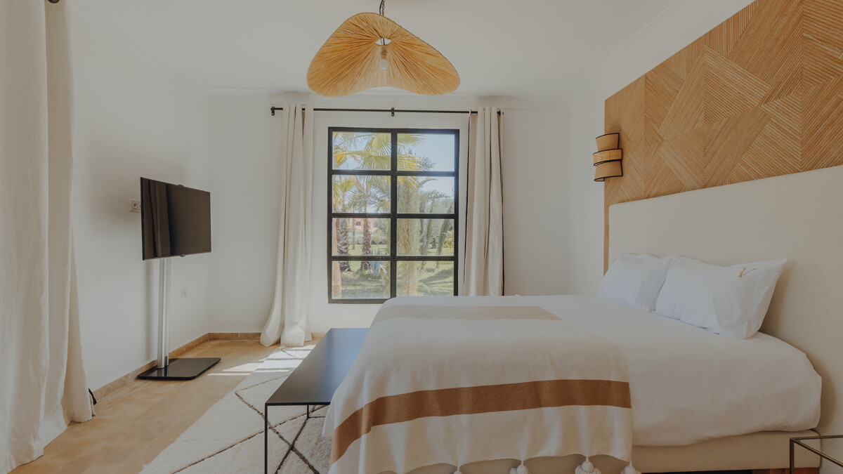 Chambre, Rez-de-chaussée. La chambre propose 1 lit double 160 cm. Salle de bain privée, avec 2 vasques, baignoire. WC dans la salle de bain. La chambre inclut également : climatisation, TV, terrasse privée.