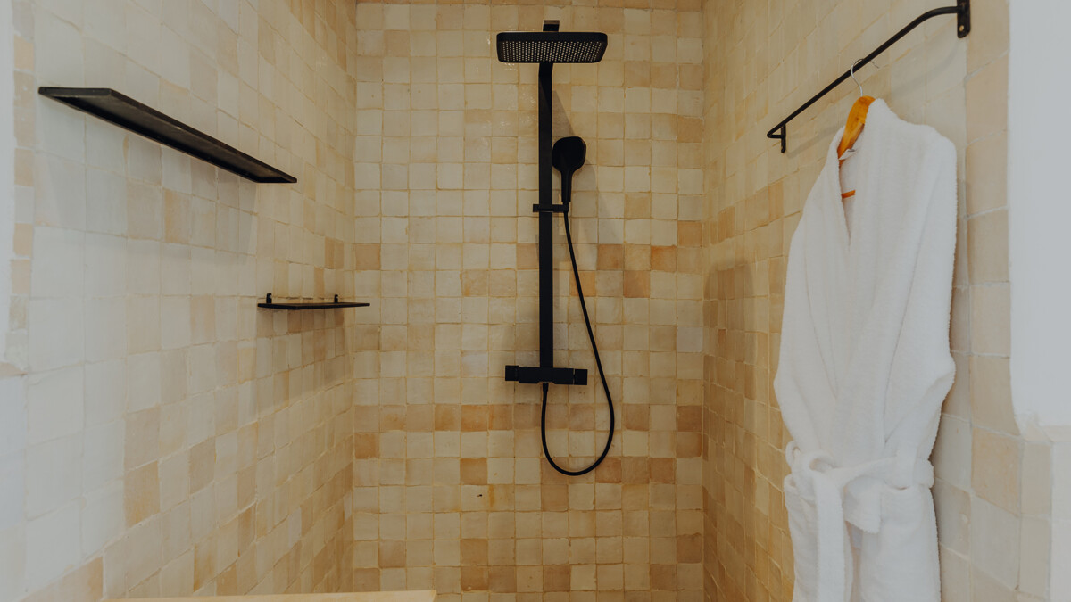 Chambre, Rez-de-chaussée. La chambre propose 1 lit double 160 cm. Salle de bain privée, avec douche. WC dans la salle de bain. La chambre inclut également : climatisation, TV, terrasse privée.