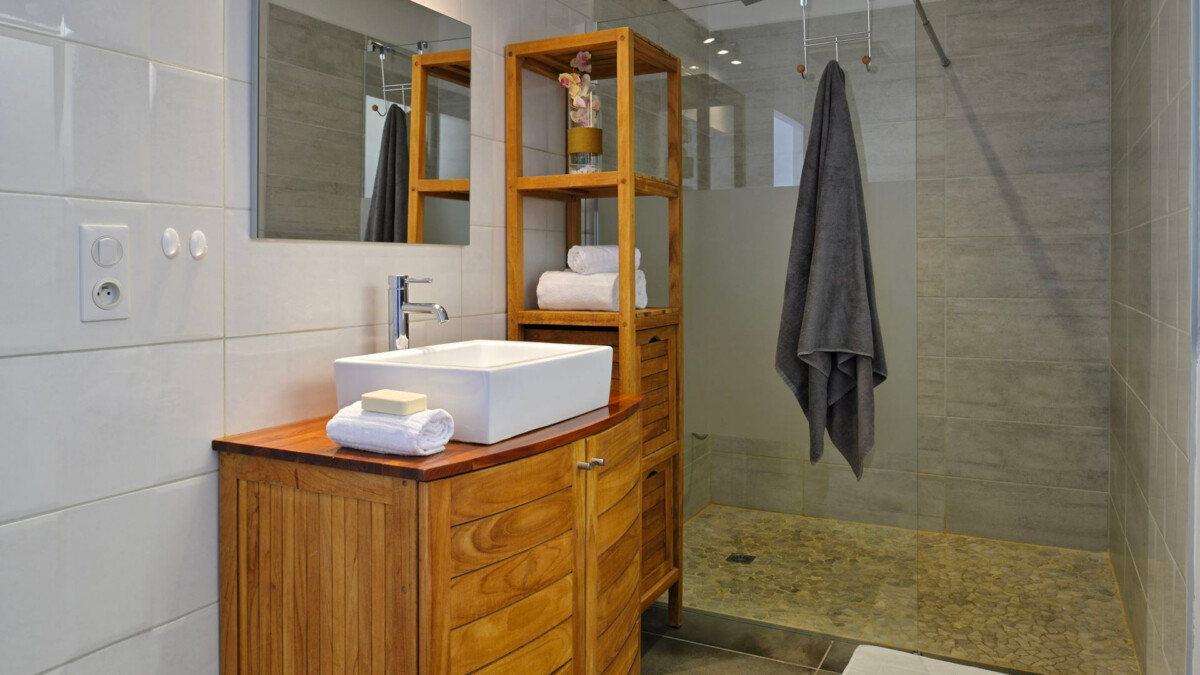 Chambre, accès direct à la piscine, accès direct à la terrasse. La chambre propose 1 lit double 160 cm. Salle de bain attenante, avec douche à l’italienne. WC séparés.