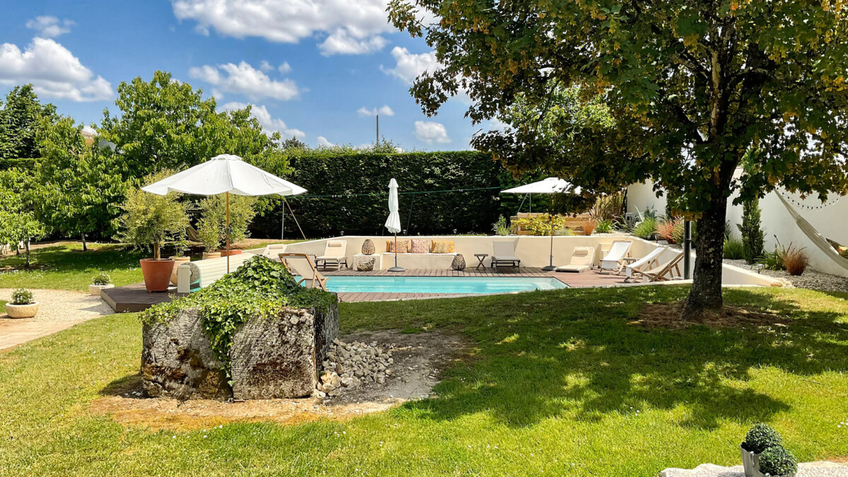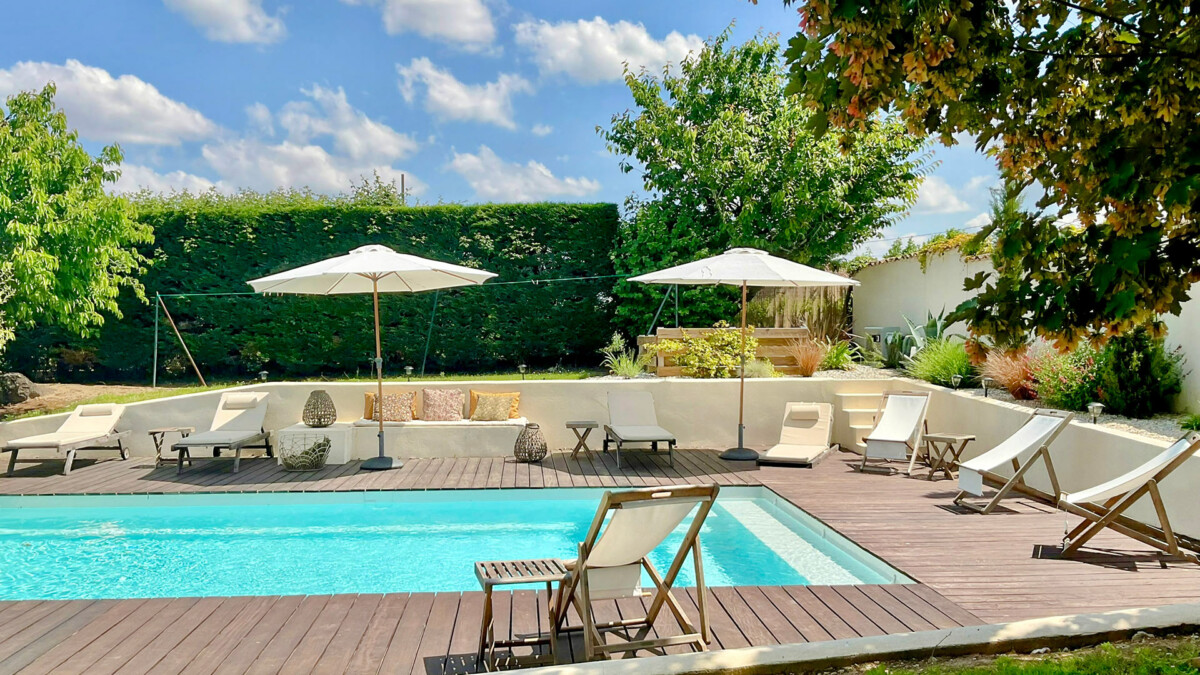 L’espace piscine : agrémenté d’un jardin méditerranéen, voici une jolie piscine chauffée (8x4m – sécurisée par un volet automatique) et une large plage de bois joliment équipée de chiliennes, transats, banc oriental.
