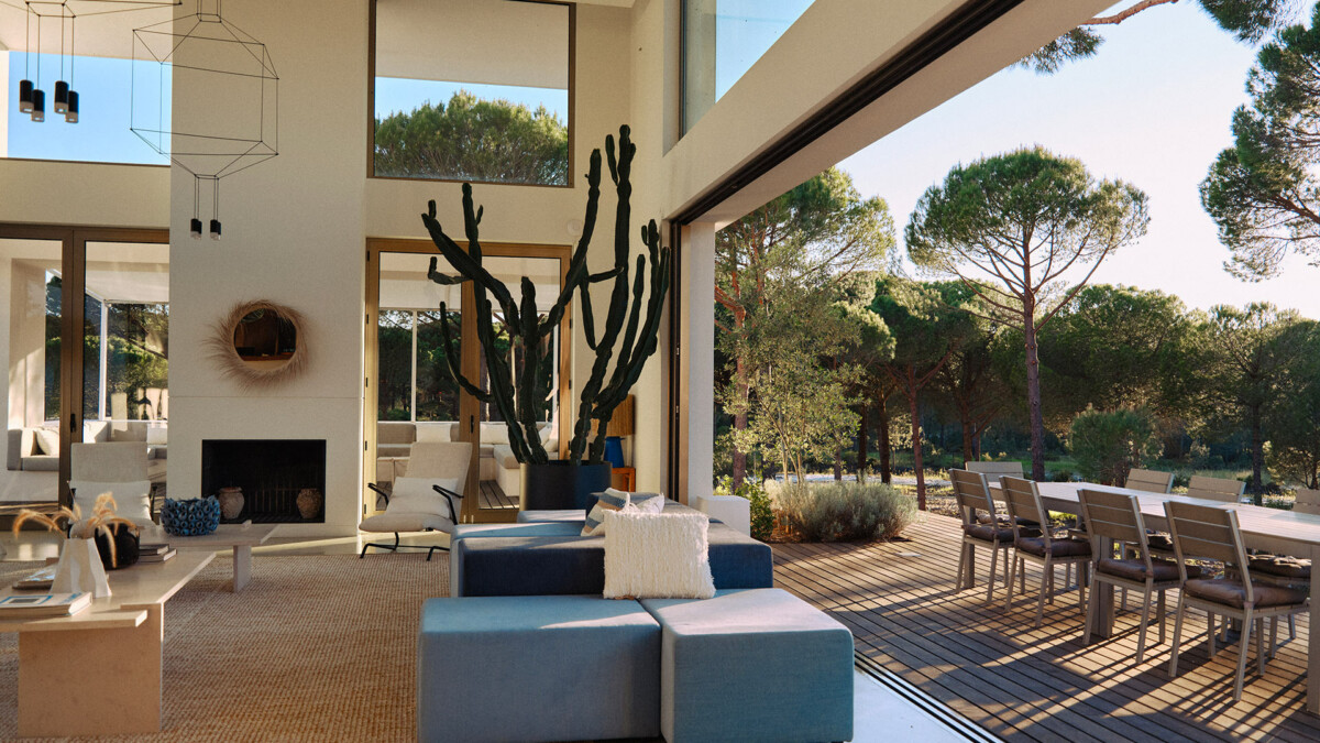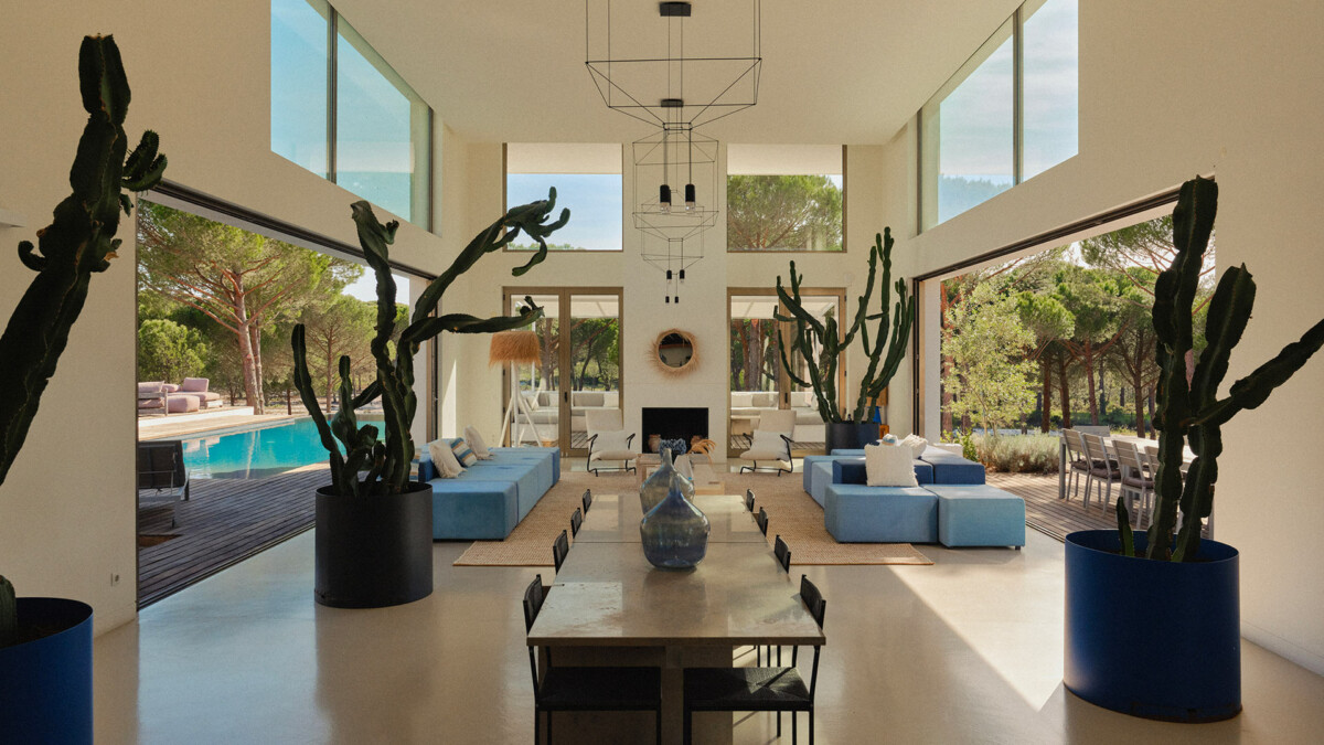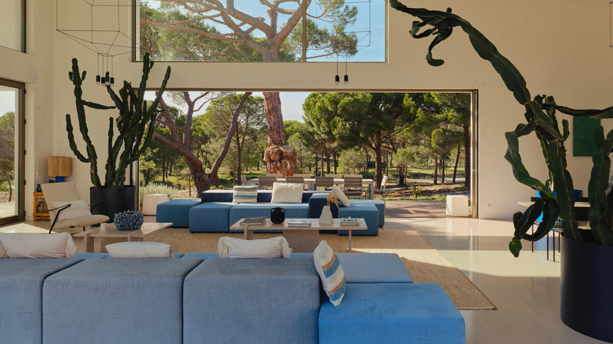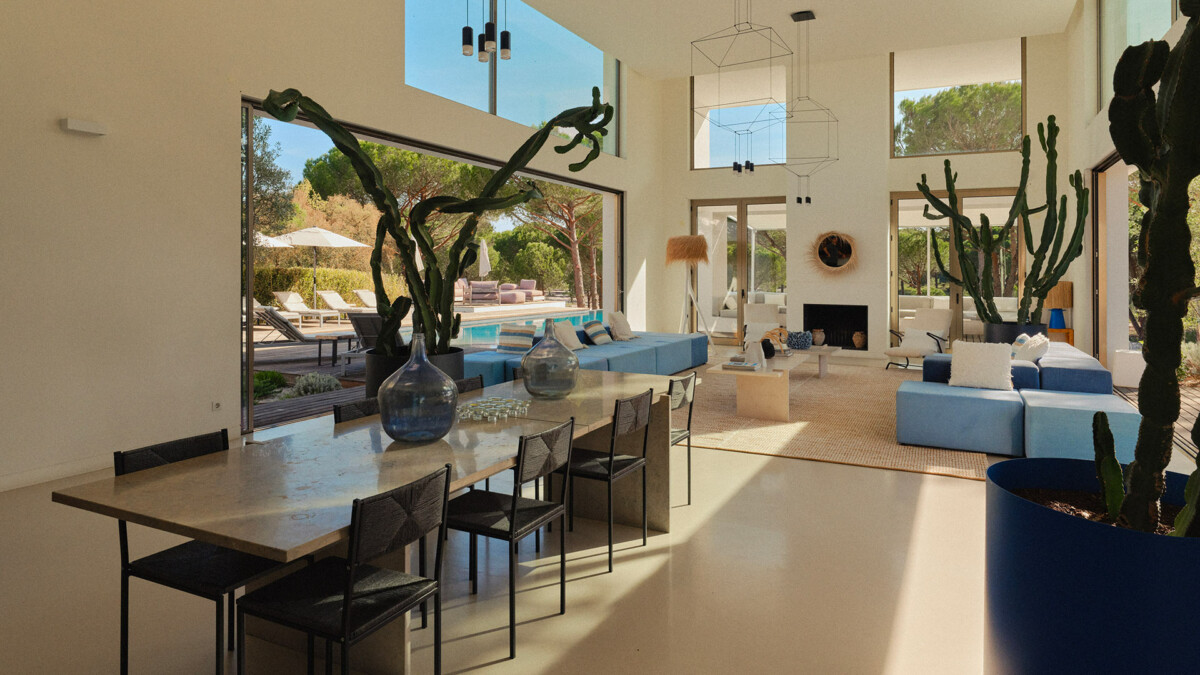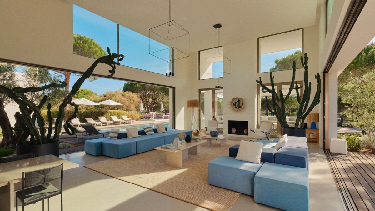 Le salon principal de cette villa possède une double hauteur de plafond, permettant de laisser rentrer énormément de lumière; tandis que le mobilier est positionné intelligemment autour des arbres d’oliviers intérieurs.