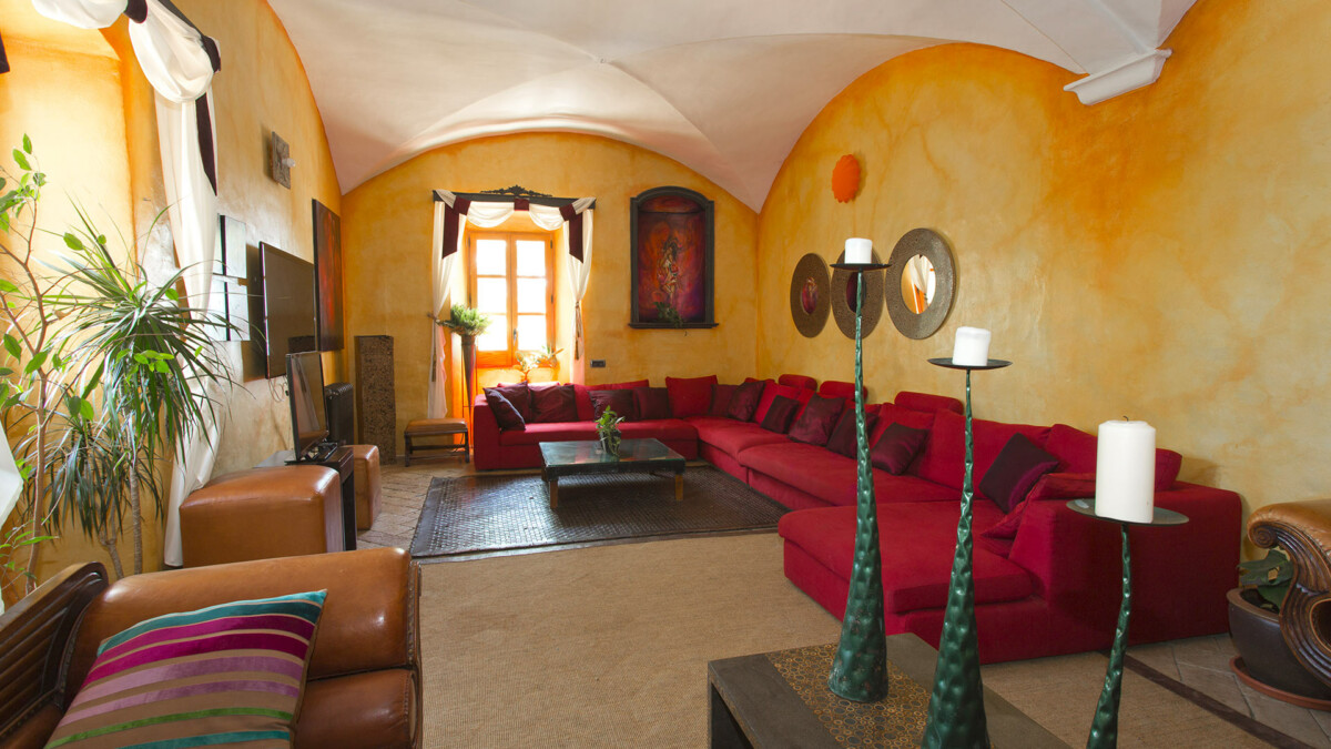 Sur la droite de l’escalier – à travers un couloir se trouve l’aile ouest. Il s’agit d’une suite avec lit double à baldaquin king size et porte donnant sur un salon séparé avec deux lits simples (90 x 190 cm) qui peuvent être réunis. Cette suite possède sa propre terrasse bien exposée.
