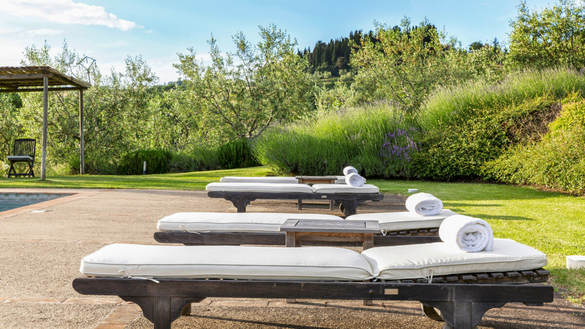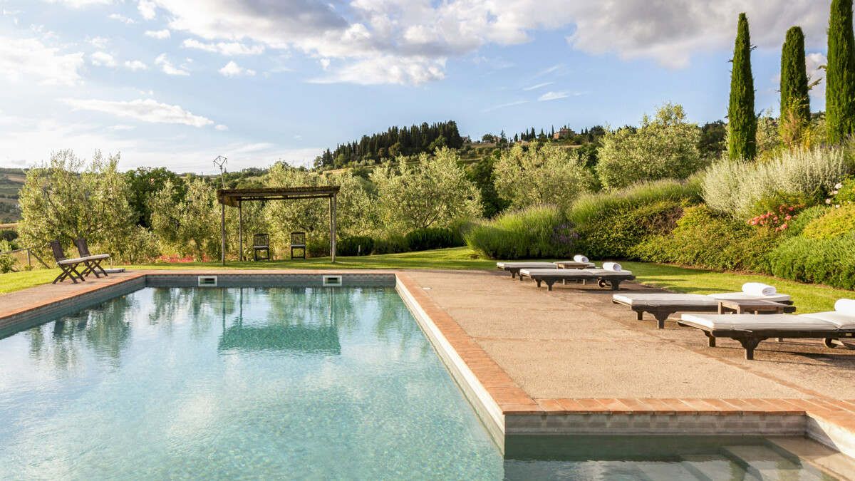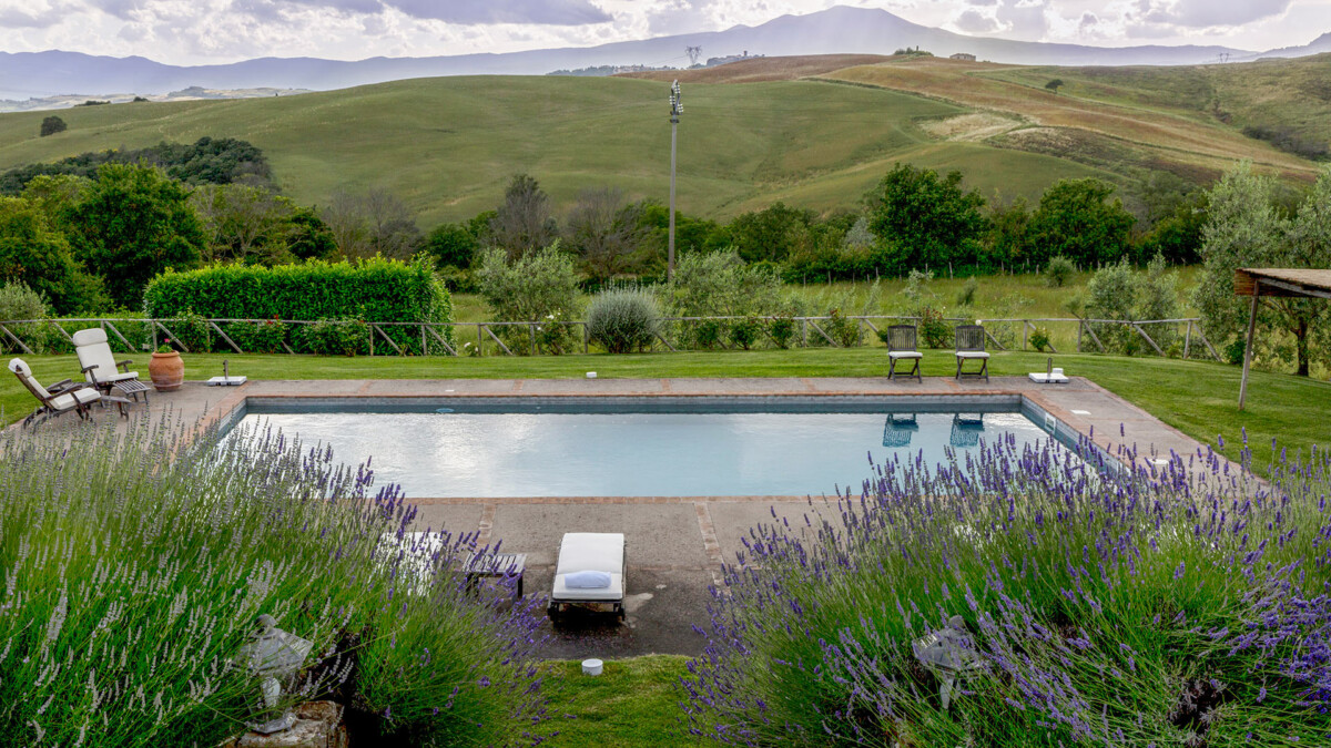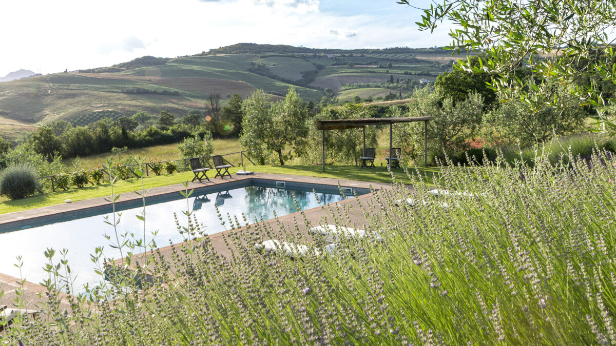 Guests can enjoy a wonderful view over the Tuscan countryside from the pool facing the hills, surrounded by wonderful flowers and vegetation.
