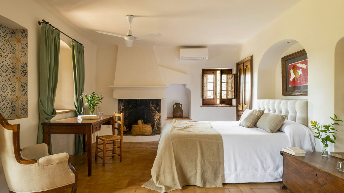Chambre. La chambre propose 1 lit double 180 cm. Salle de bain privée. La chambre inclut également : climatisation, cheminée, table de bureau, terrasse privée.