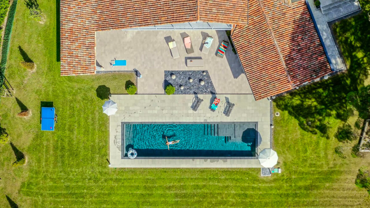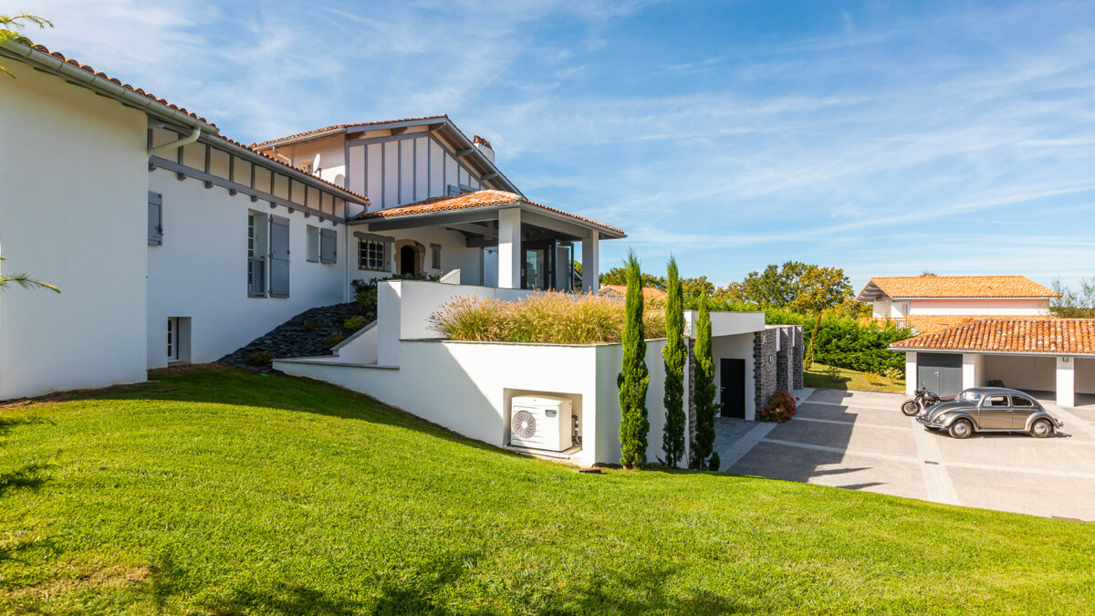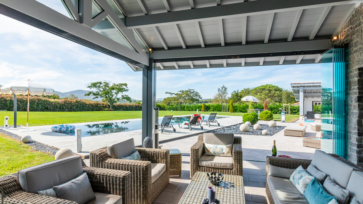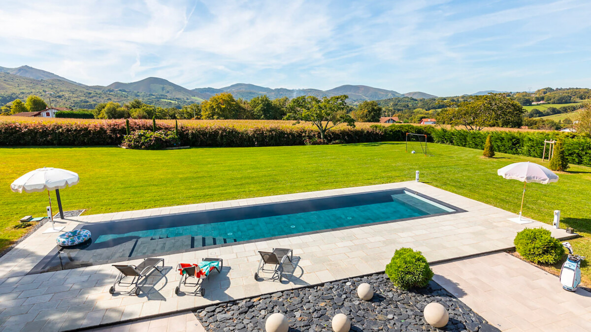 L’extérieur de la villa est un véritable havre de paix, avec une vue panoramique sur la Rhune. Le jardin spacieux s’offre à vous depuis la véranda, qui peut être ouverte en totalité pour se fondre dans la nature environnante. Lieu parfait pour se détendre, la terrasse baignée de soleil se joint à une piscine chauffée (de fin avril à mi septembre) (16,5m x 4m/1.45m). Un salon d’été avec plancha est également à votre disposition pour concocter vos repas en plein air. La villa dispose également de 8 places de parking.