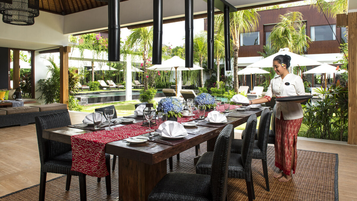 Le magnifique salon/salle à manger ouvert s’ouvre sur le jardin tropical. C’est l’endroit idéal pour passer une bonne soirée en famille ou entre amis après un délicieux repas local.