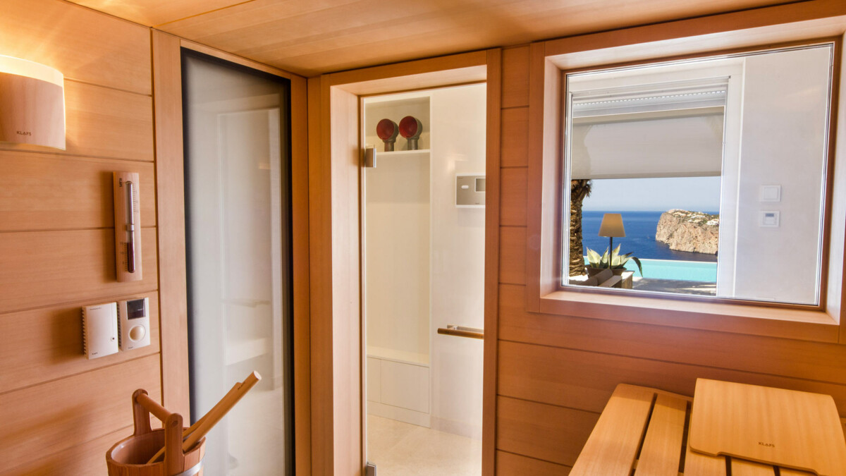 Le niveau terrasse accueille également l’espace spa avec ses équipements de fitness, son sauna et son salon ainsi que ses propres WC et douche. Les clients peuvent profiter d’une vue parfaite sur le coucher de soleil – et sur Ibiza.