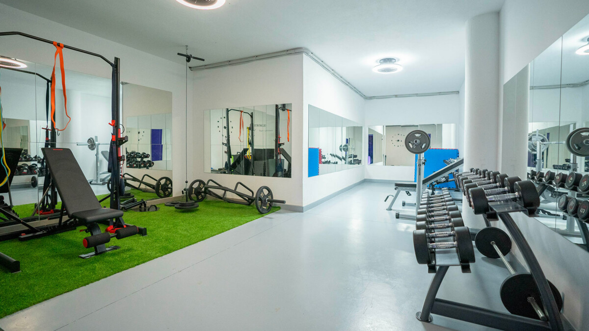 A l’étage inférieur, la maison dispose aussi d’une salle de sport entièrement équipée (bancs de musculation, haltères, barres de traction, sac de frappe et poids).