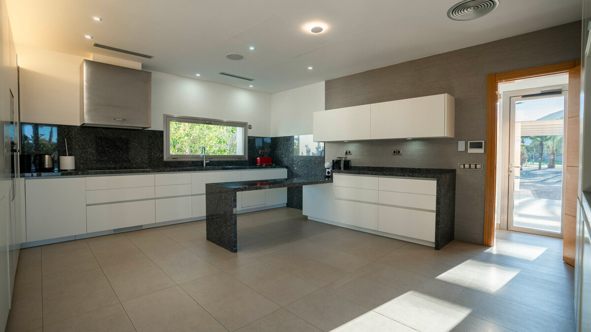 La cuisine donne également accès à une buanderie entièrement équipée (lavabo, machine à laver, sèche-linge et rangements). De là, vous pouvez accéder à une zone réservée pour sécher le linge et jeter les déchets. C’est également de là que l’on accède au parking souterrain.
