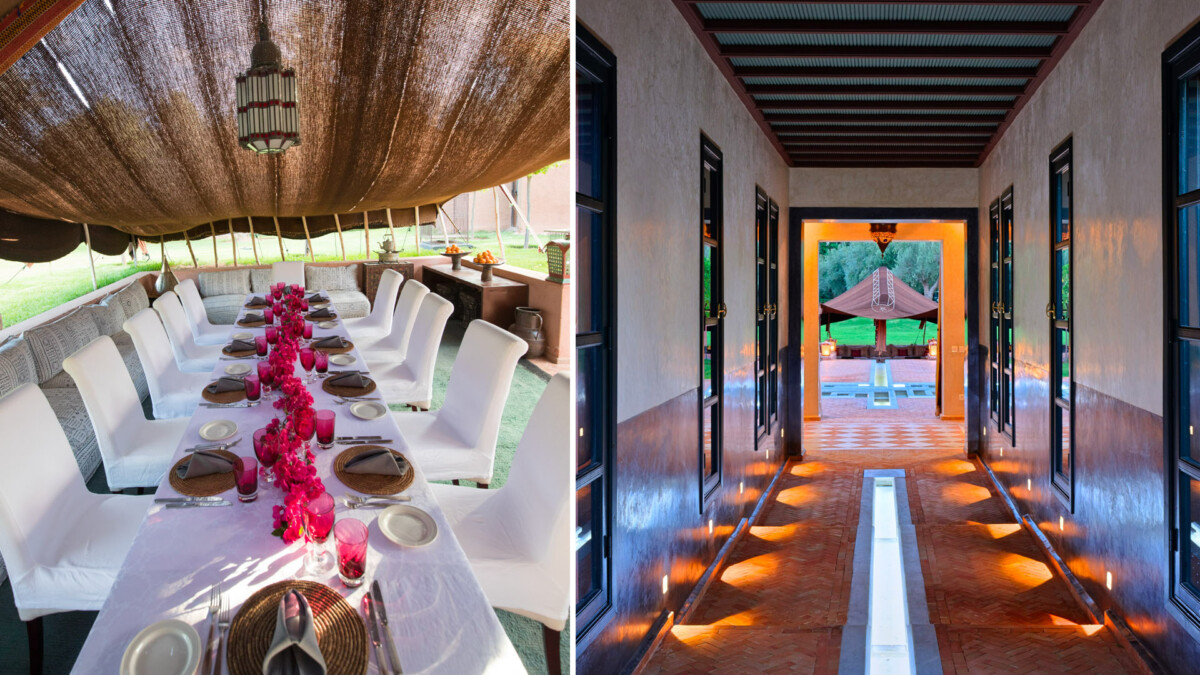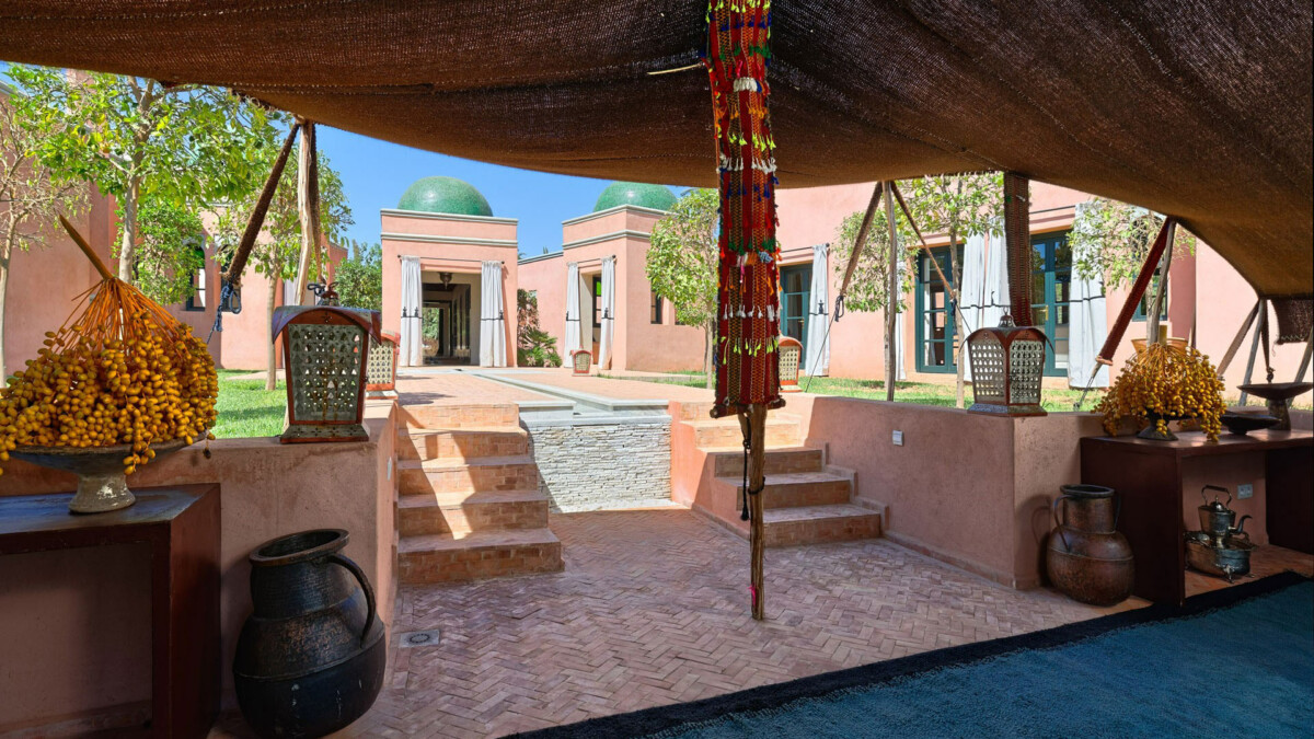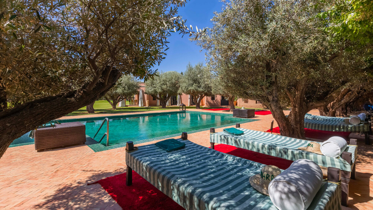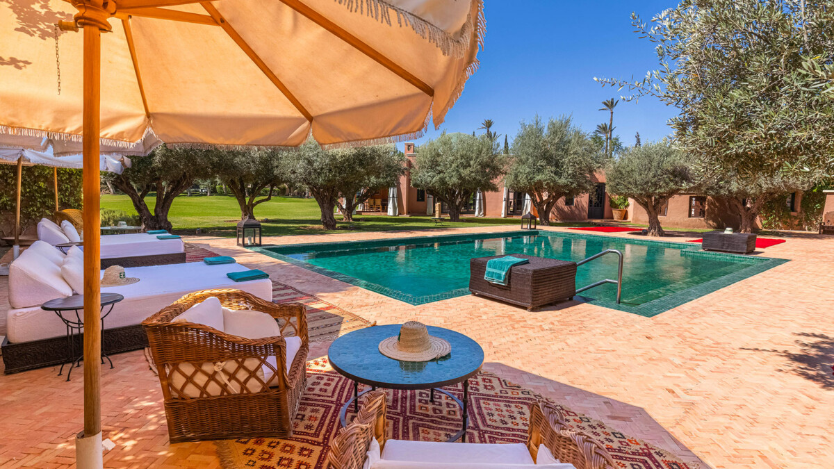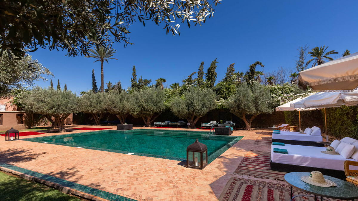 La piscine de la villa mesure 12,8 mètres. Elle est équipée de chaises longues et daybeds indiens. Une grande tente berbère est proposée dans le jardin; c’est un endroit merveilleux pour prendre un apéritif le soir. Il y a une terrasse surplombant la piscine ainsi qu’un salon / salle à manger intérieur avec cheminée et un beau plafond en forme de dôme.