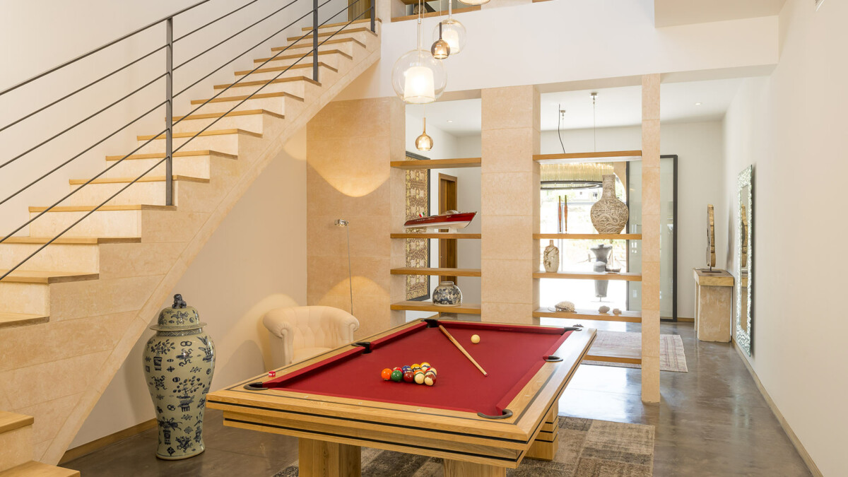 La villa dispose d’une cuisine Bulthaup entièrement équipée et d’un barbecue avec four à bois. Deux salons offrent de nombreux divertissements. Les clients peuvent notamment profiter d’un billard et d’un agréable salon TV avec son Dolby.
