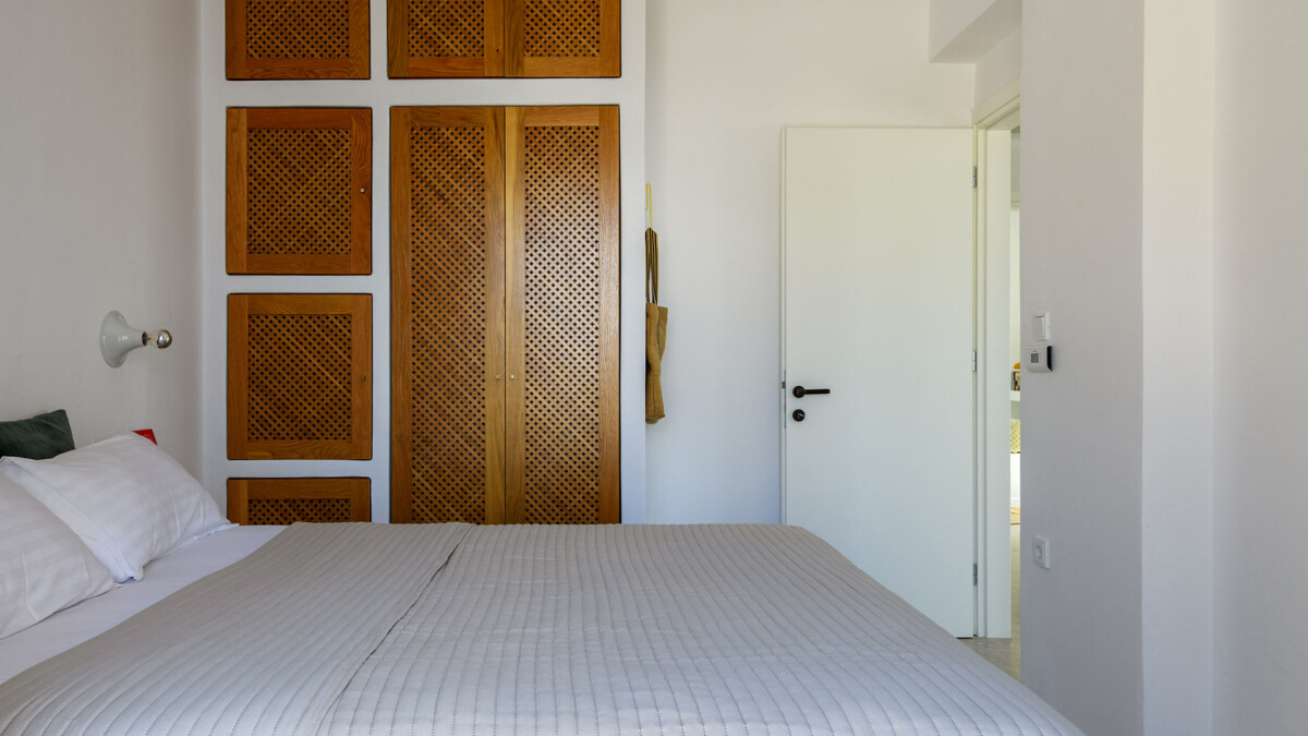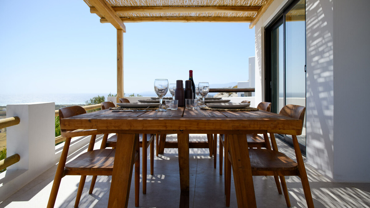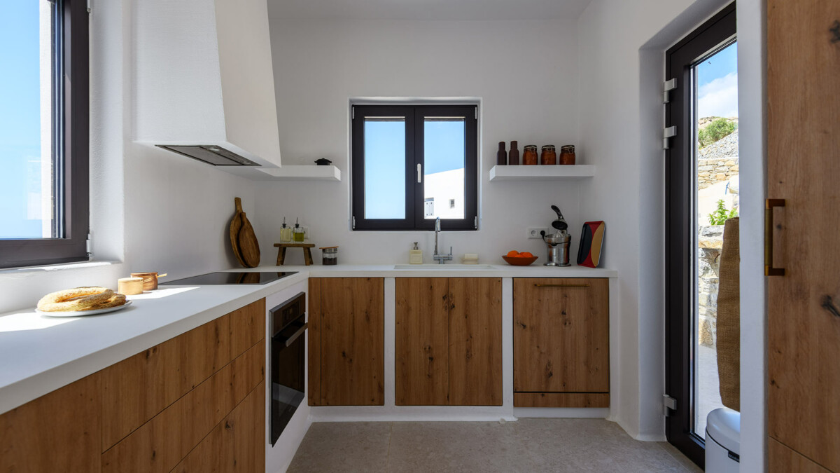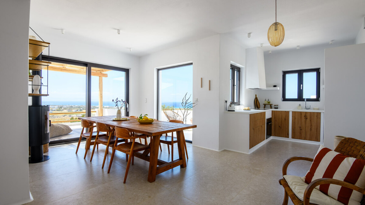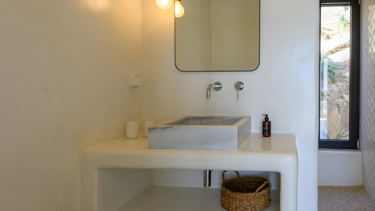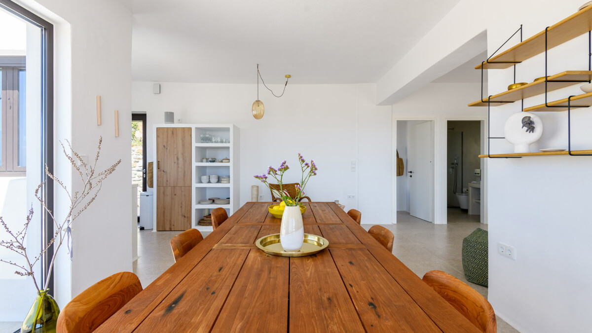 Les espaces extérieurs sont conçus pour offrir un équilibre parfait entre relaxation et contemplation de la nature environnante. Ici, la nature règne en maître, entourant les lieux de rochers sauvages, d’une piscine avec vue sur mer (12 x 4m – Profondeur : min : 1.20 et max : 1.80m) et de la présence d’oliviers aux côtés des plantes locales. Autour de la piscine, un espace aménagé avec transats et parasols invite à la détente. La villa dispose également d’une cuisine d’été équipée pour les repas en plein air, avec une table à manger sous une pergola ombragée, parfaite pour savourer des repas conviviaux.