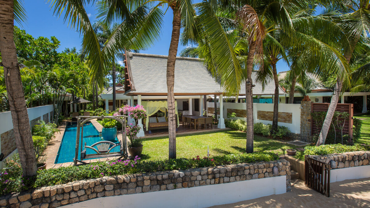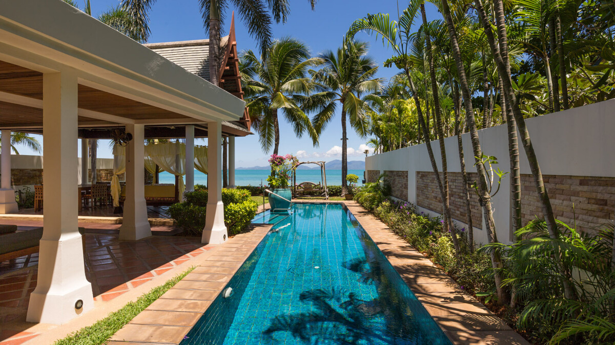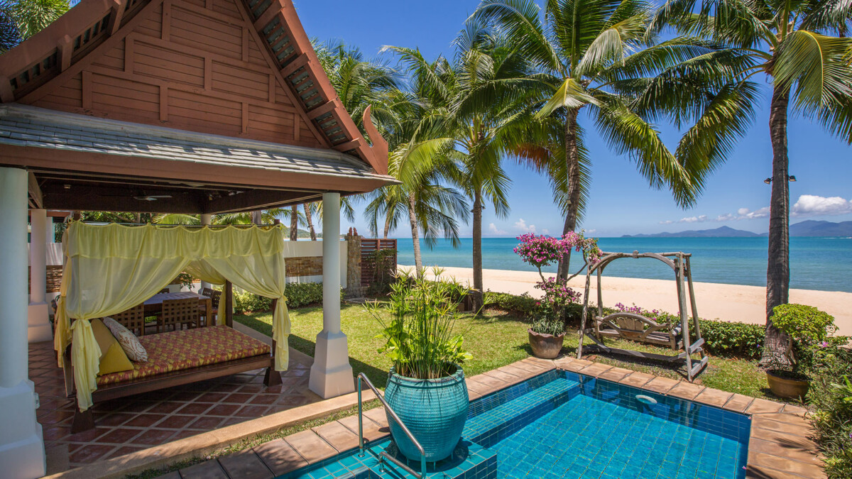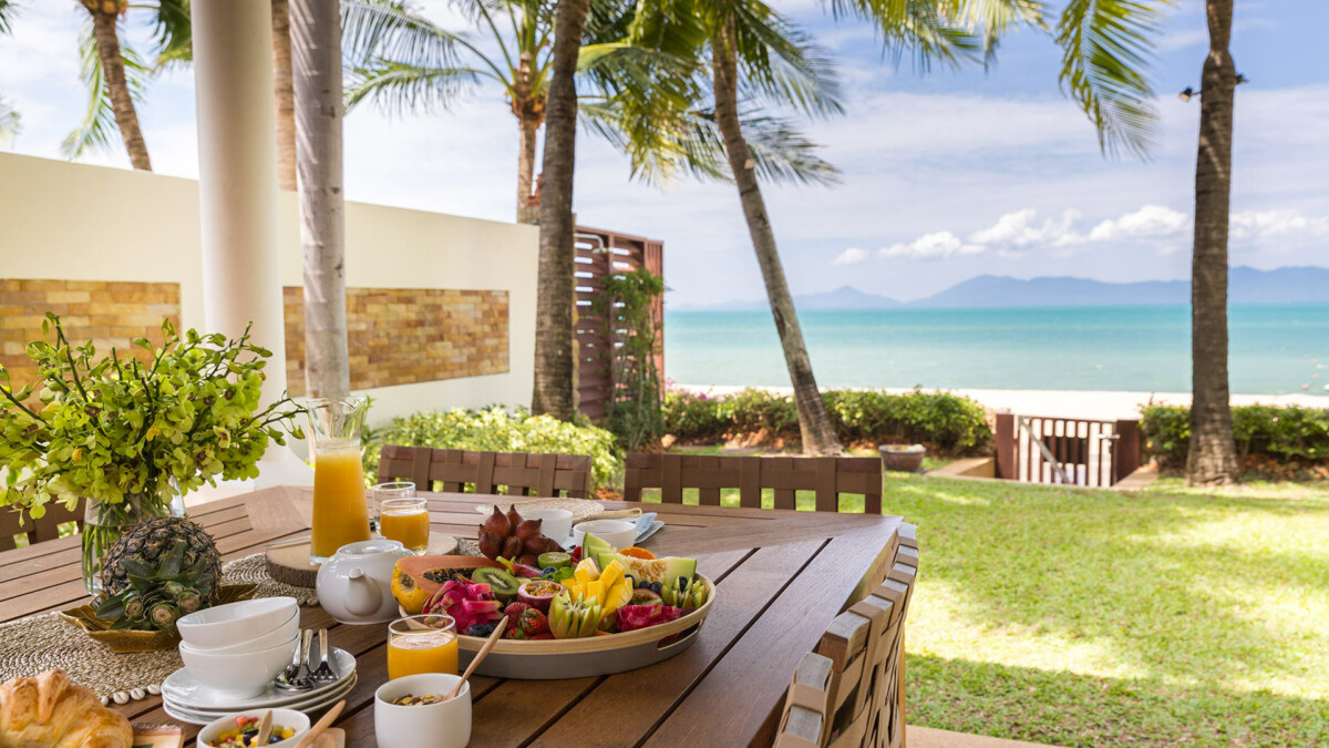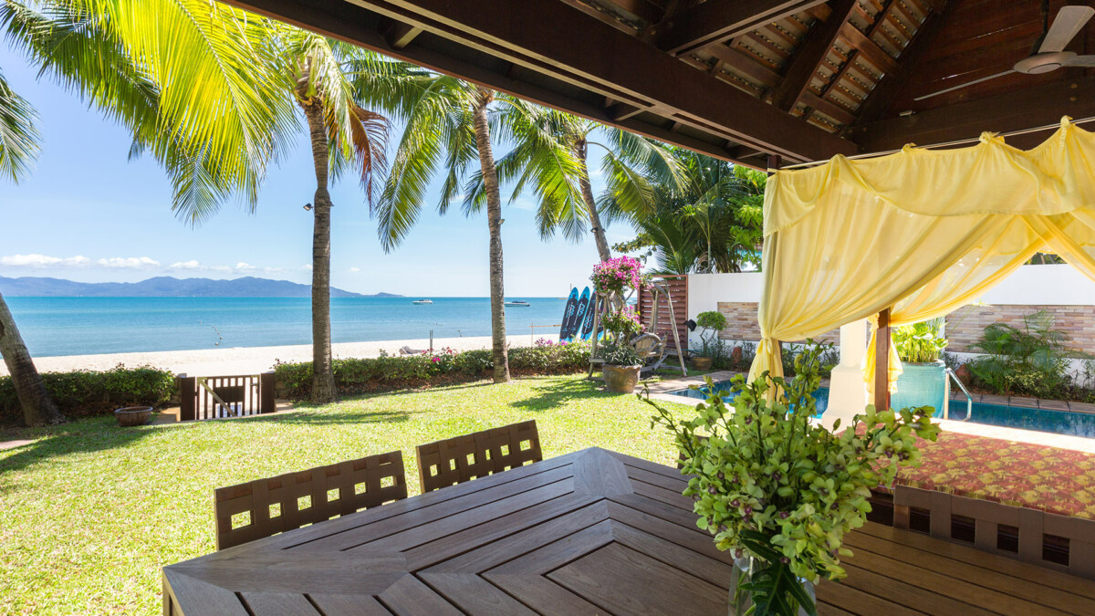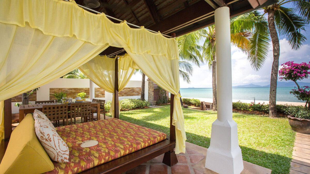 La terrasse avant comprend un espace lounge et une table à manger sous une Sala thaïlandaise, un endroit agréable pour profiter de la vue sur l’océan, à moins que vous préfériez l’admirer tout en nageant dans la piscine privée.