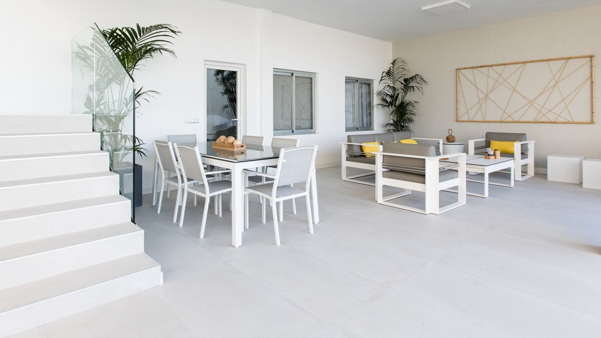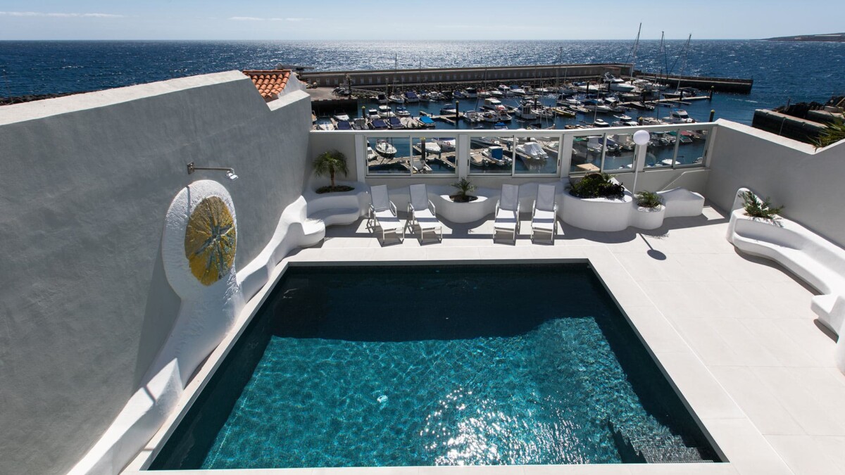 La terrasse est très lumineuse et spacieuse, et dispose d’une vue splendide sur le port et la mer.