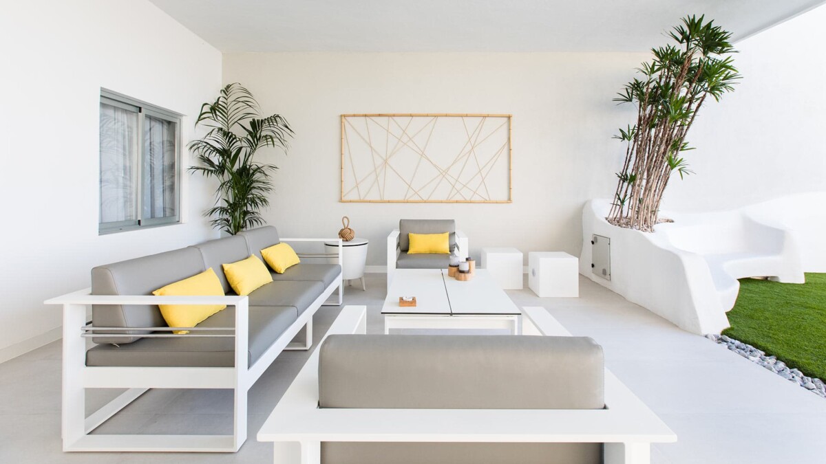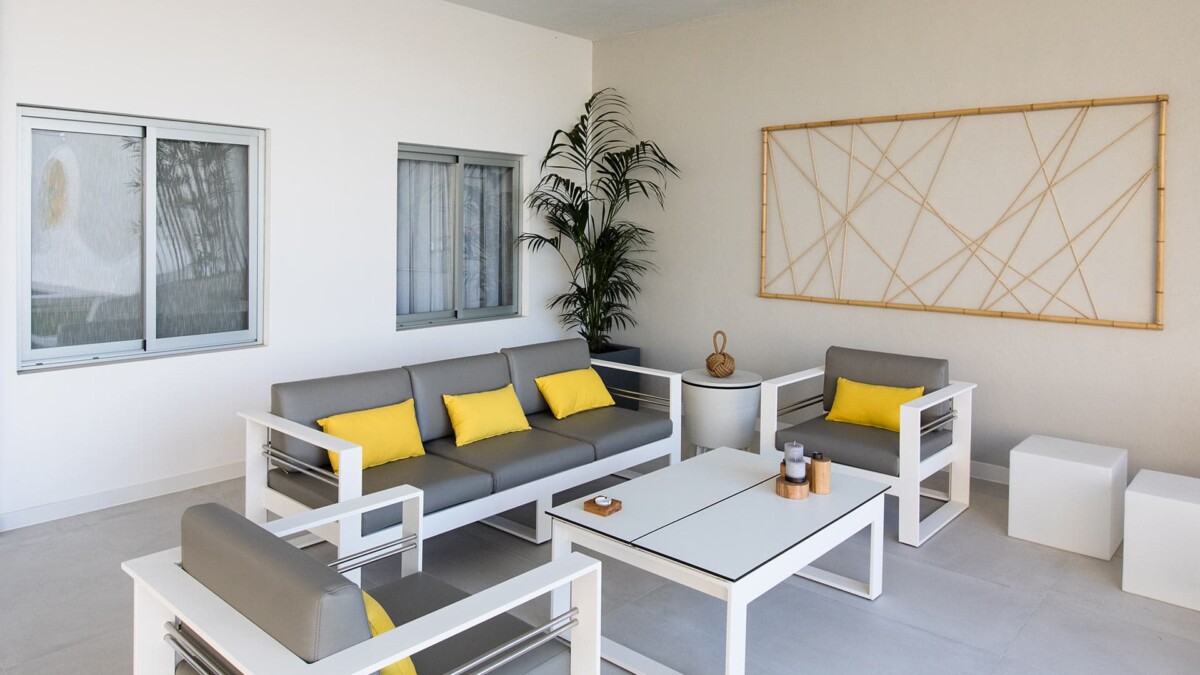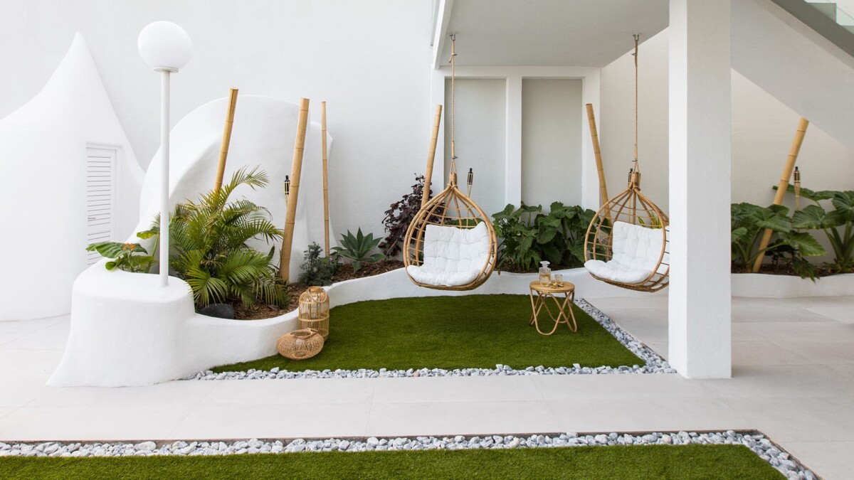 Un petit espace lounge avec deux fauteuils suspendus vous permet de vous détendre à l’ombre, tandis qu’un espace lounge plus grand est idéal pour un apéritif en extérieur, ou un déjeuner en famille.