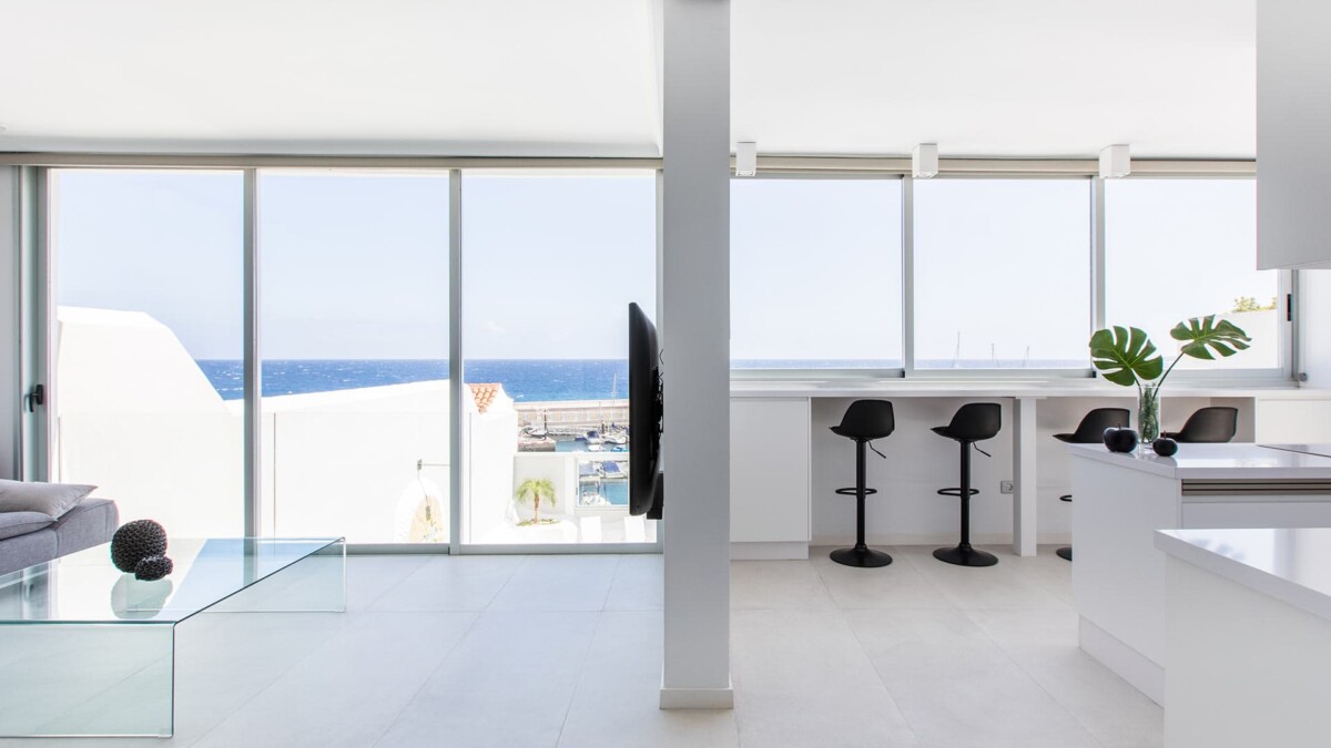 Enfin, au rez-de-chaussée se trouve la pièce de vie principale, très lumineuse, avec la cuisine moderne entièrement équipée ouverte, et un comptoir face aux larges fenêtres, idéal pour profiter d’un petit-déjeuner avec vue sur la mer, vous trouverez également le salon/salle à manger avec TV et grande baie vitrée offrant toujours une splendide vue sur la mer.