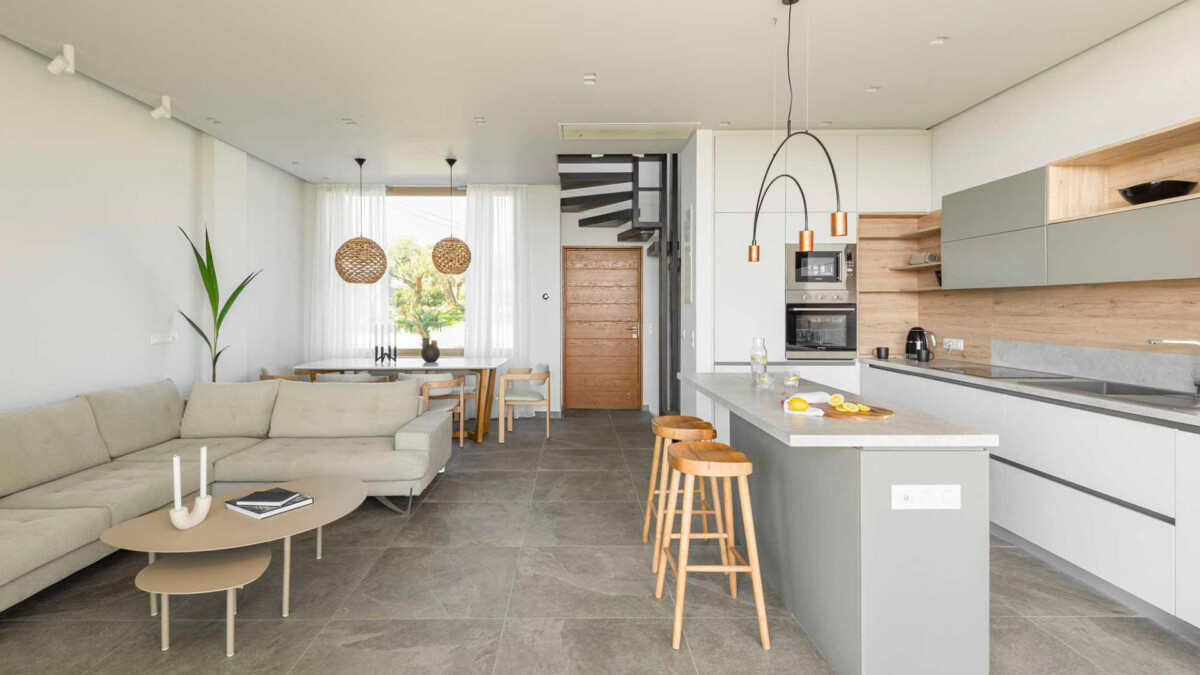 Cette spacieuse villa offre 4 chambres et 4 salles de bains au total et peut accueillir jusqu’à 8 personnes. La zone du demi-sous-sol est maintenue au frais pendant les mois d’été et est suffisamment éclairée par la lumière naturelle à travers deux grandes fenêtres vitrées qui s’ouvrent sur un petit jardin personnel. Le rez-de-chaussée comprend une cuisine entièrement équipée, un coin repas et un coin salon avec une télévision. De là, l’horizon s’ouvre offrant une vue parfaite au premier plan sur le golfe Toronéen avec l’île de Kelyfos, à travers la péninsule de Kassandra et à l’ouest profond, sur les sommets du mont Olympe.