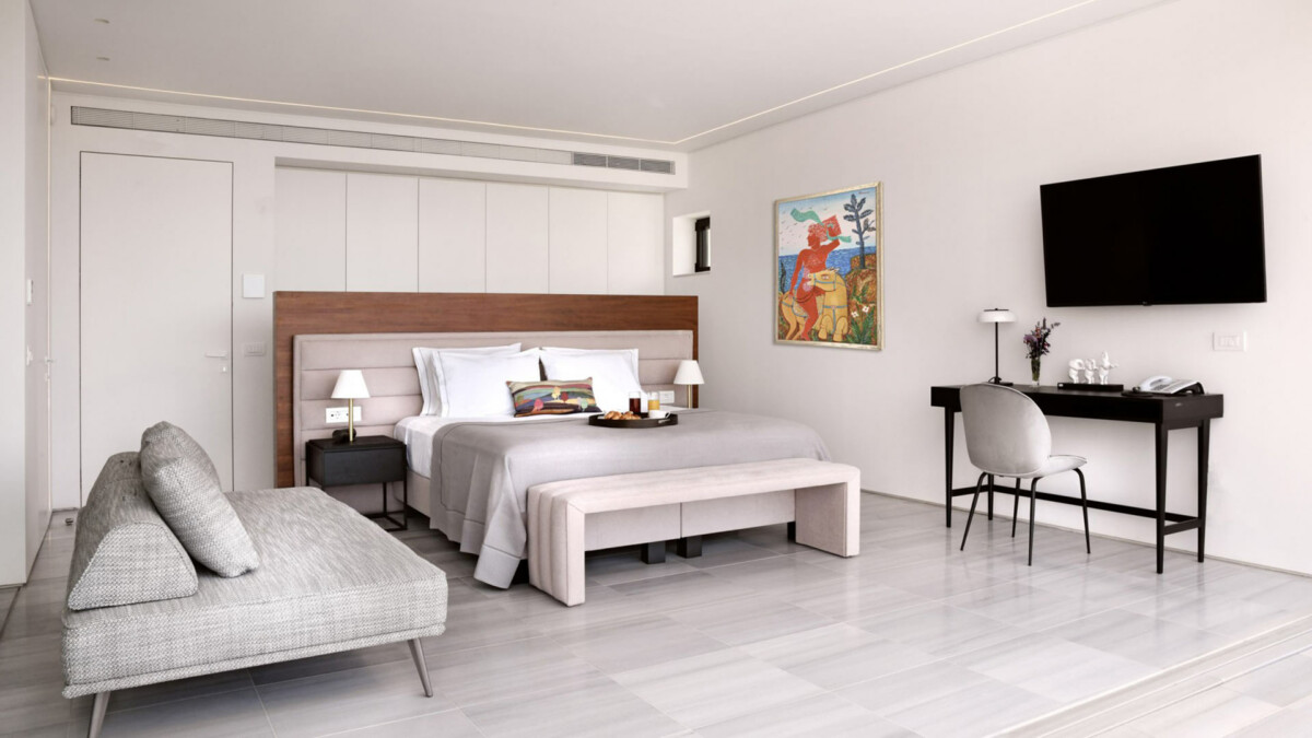 Chambre, 1er étage. La chambre propose 2 lits jumeaux transformables en lit double. Salle de bain privée, avec 2 vasques, baignoire, douche. WC dans la salle de bain. La chambre inclut également : climatisation, table de bureau, TV, coffre fort, dressing, balcon.