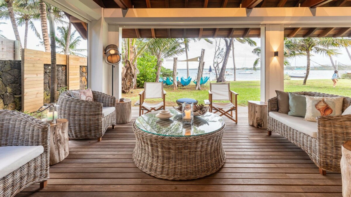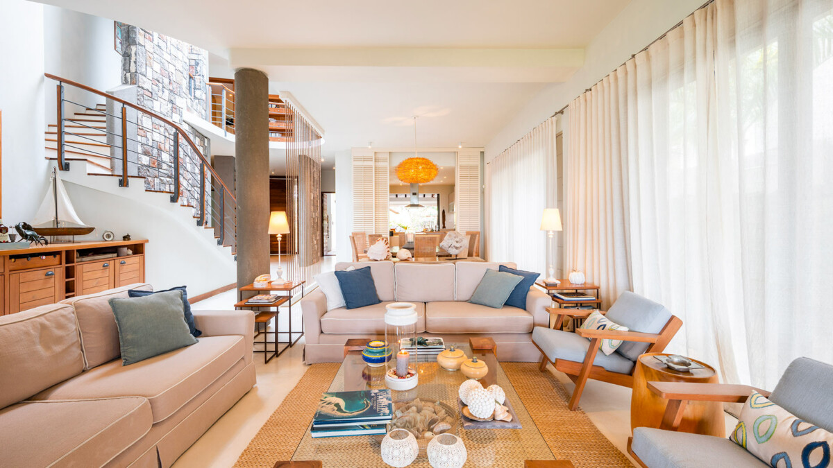 Longeant une belle étendue de sable blanc à Trou d’Eau Douce, cette villa conçue par l’architecte Jean-François Adam est résolument chaleureuse.