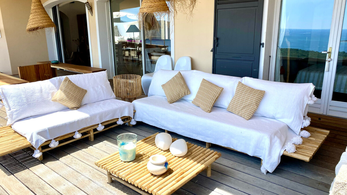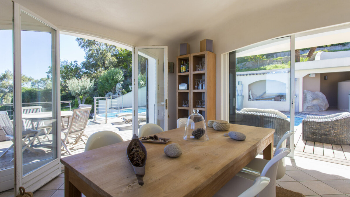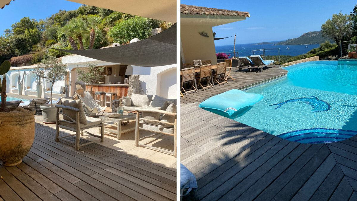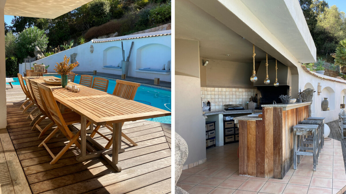 A l’extérieur de multiples terrasses en teck permettent de circuler facilement et de profiter de la piscine. Une terrasse avec coin repas et coin salon dispose de vues époustouflantes sur toute la baie, l’autre terrasse abritée donne sur la piscine et dispose d’un coin repas et un grill ainsi que de tables basses et canapés. Des transats sont à disposition. La piscine (10m x 5m) n’est pas cloturée mais offre une sécurité enfant par système d’alarme.
