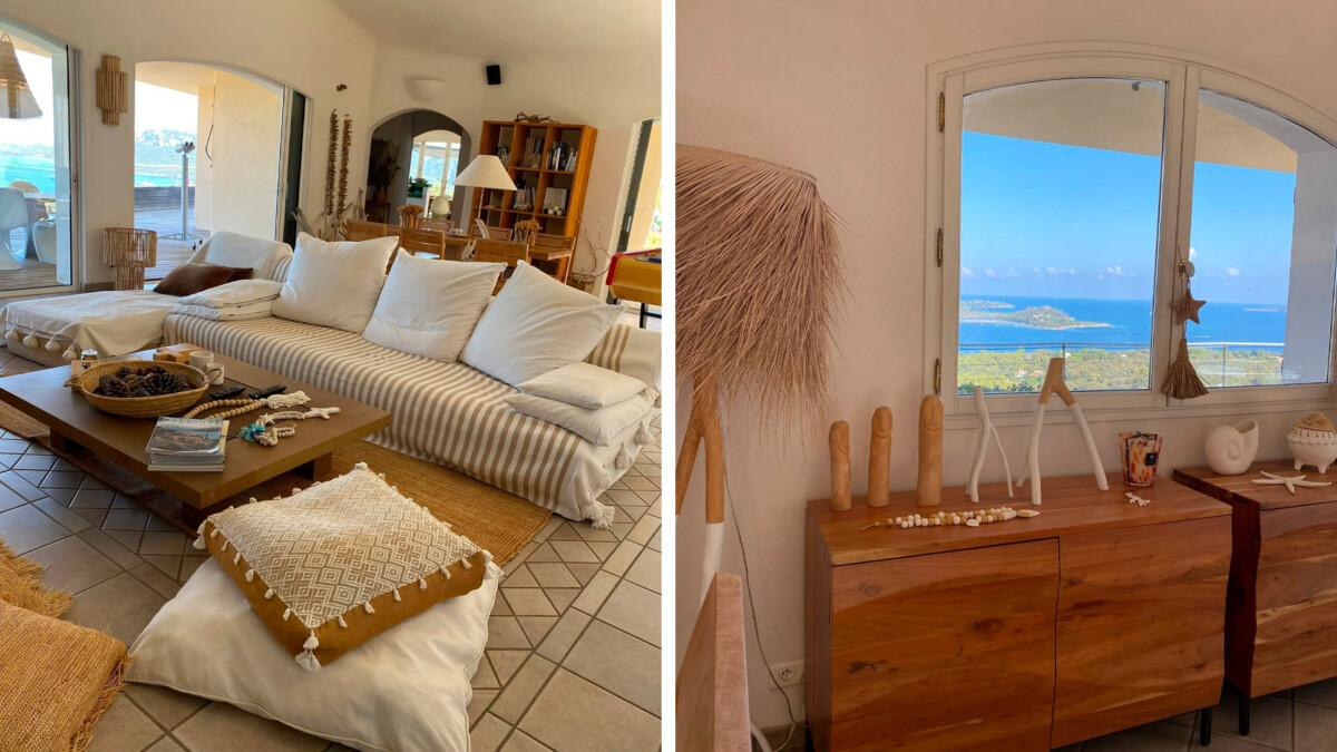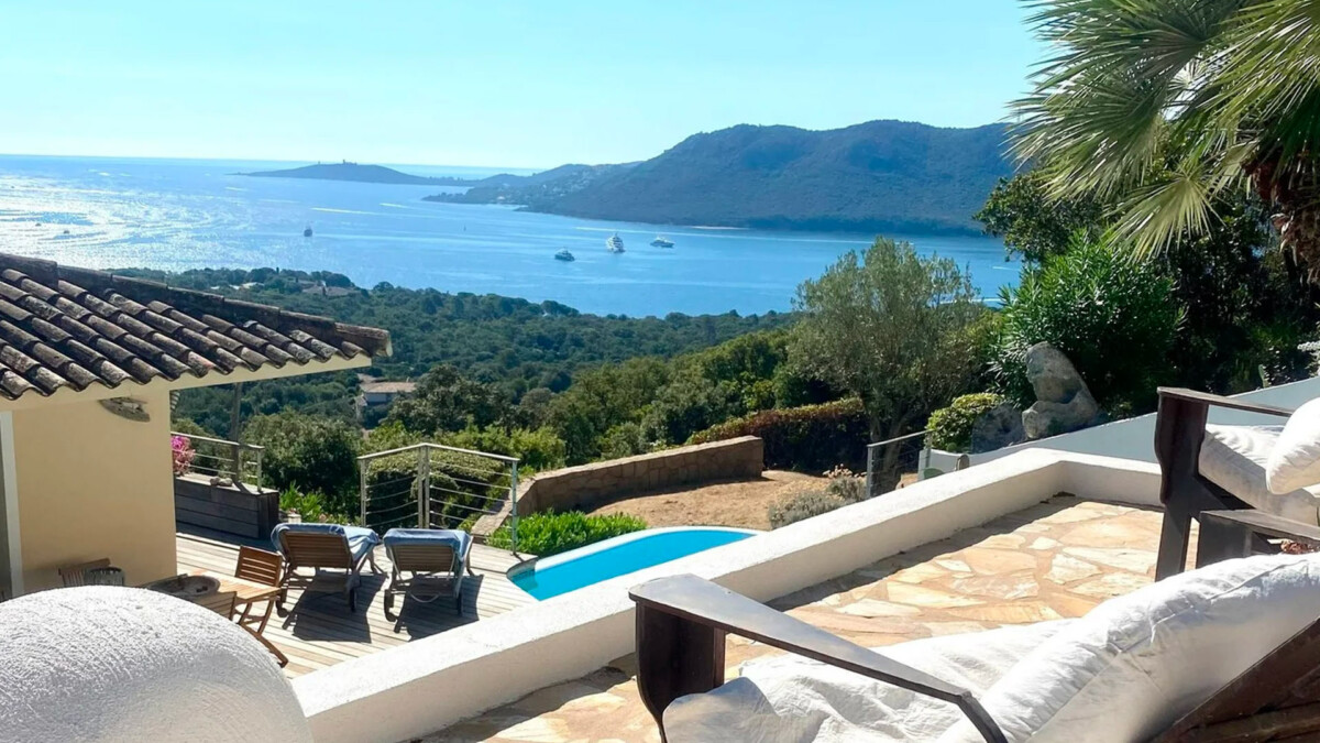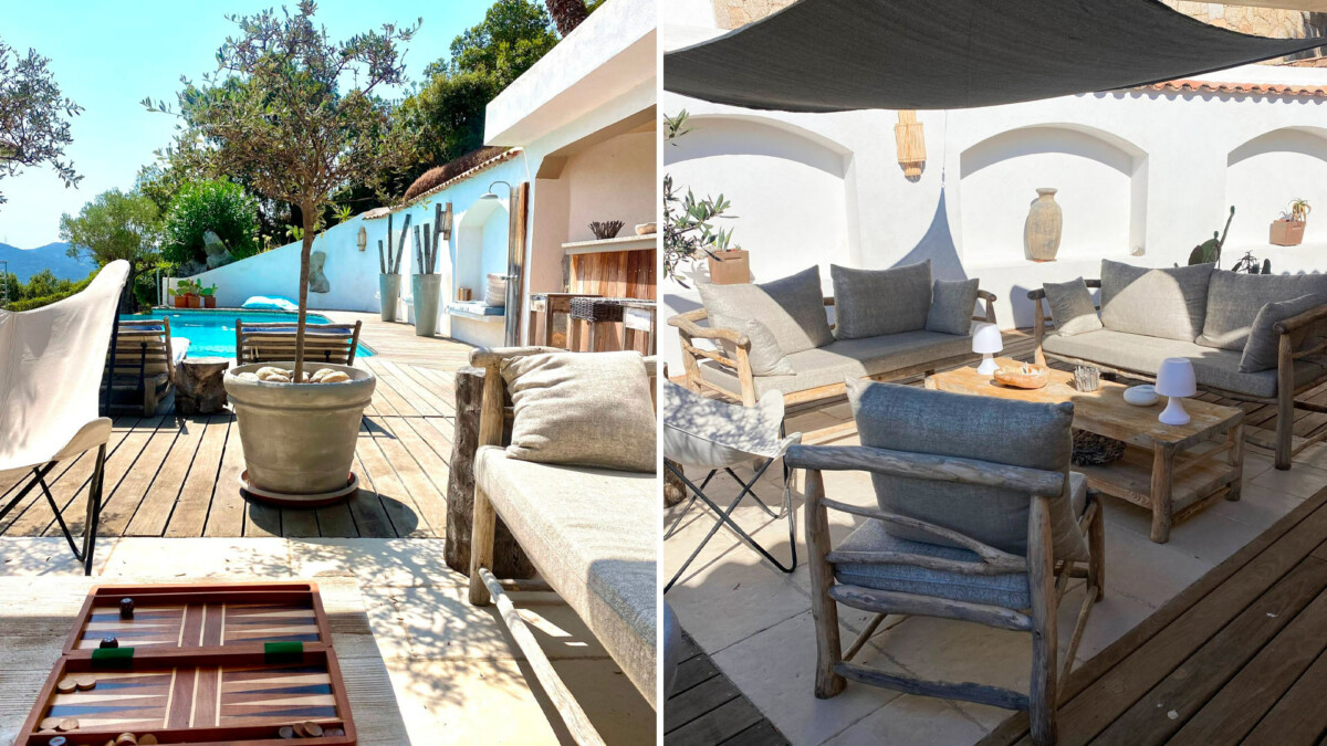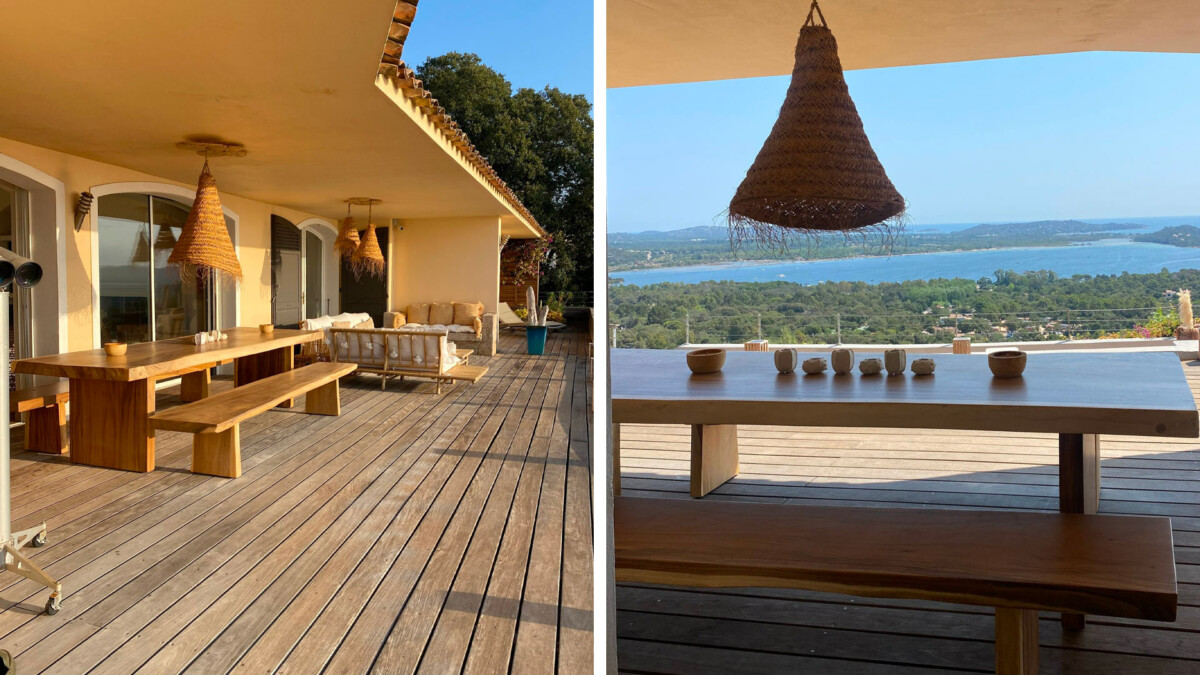 A l’extérieur de multiples terrasses en teck permettent de circuler facilement et de profiter de la piscine. Une terrasse avec coin repas et coin salon dispose de vues époustouflantes sur toute la baie, l’autre terrasse abritée donne sur la piscine et dispose d’un coin repas et un grill ainsi que de tables basses et canapés. Des transats sont à disposition. La piscine (10m x 5m) n’est pas cloturée mais offre une sécurité enfant par système d’alarme.