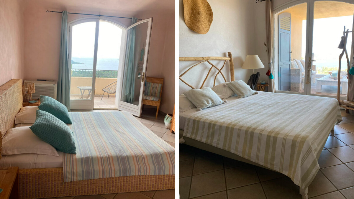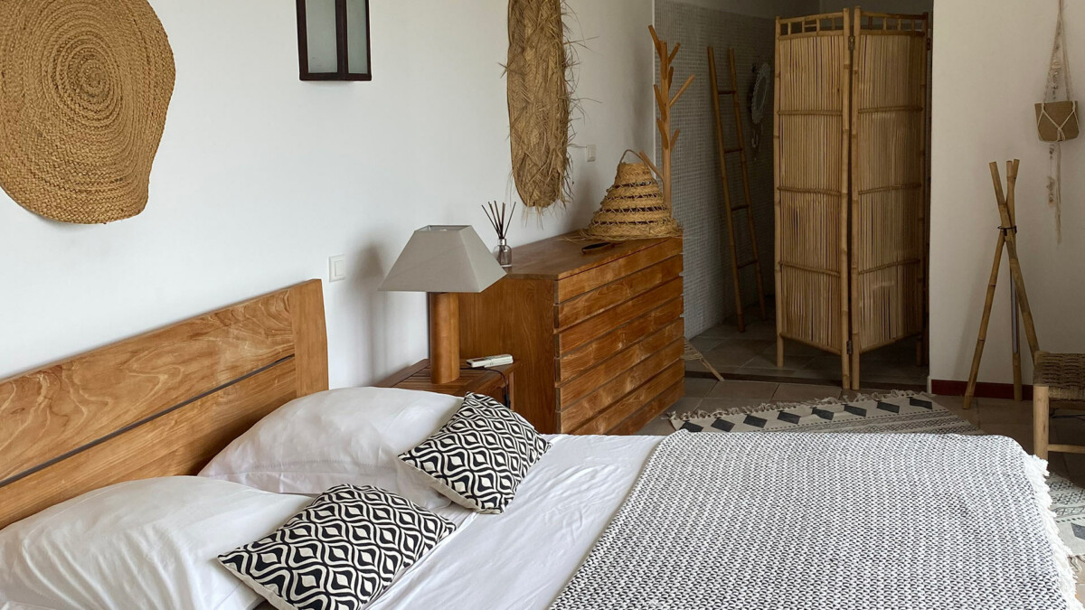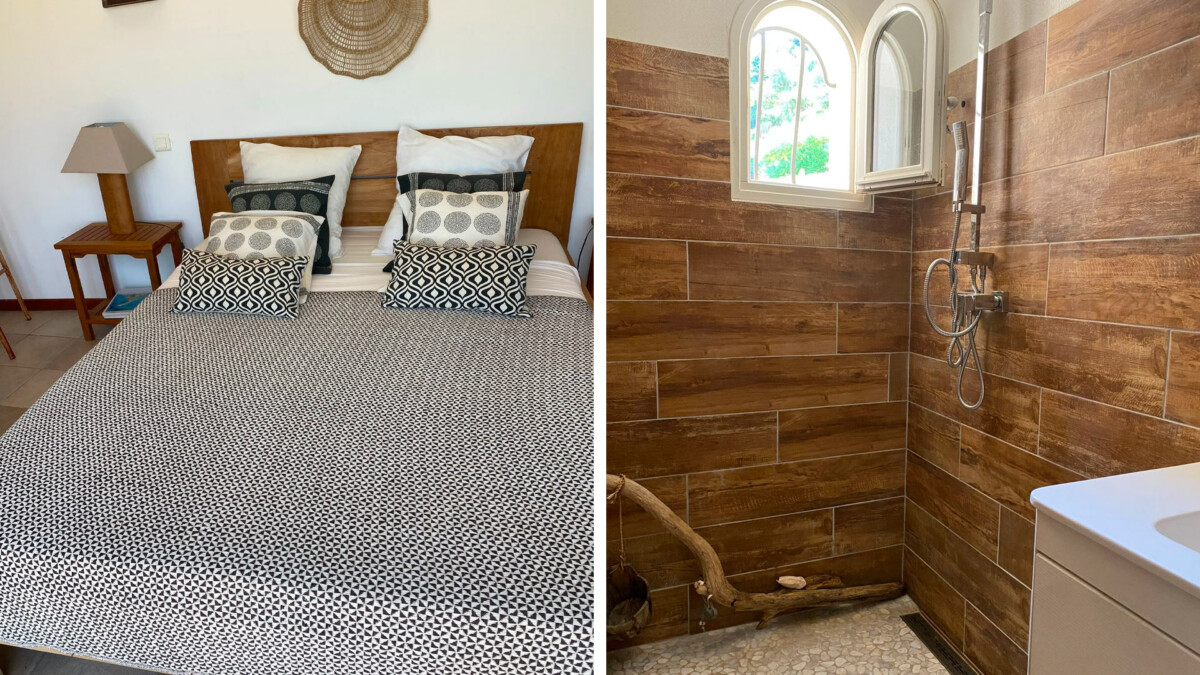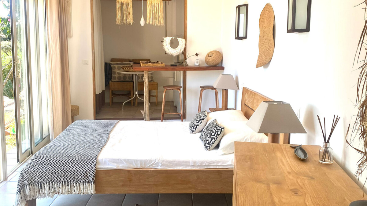 La chambre principale (lit 200×200 cm, salle de bain ensuite, A/C) et une deuxième chambre double (lit 160×200 cm, salle de bain à l’extérieur de la chambre, A/C) sont au même niveau que les pièces communes de la villa. Au niveau supérieur 2 autres chambres (lit 160×200 cm, salle de bain privative, A/C) ayant chacune une salle d’eau sont proposées. En rez-de-jardin (étage inférieur), une chambre indépendante (lit 160×200 cm, A/C) est équipée d’une kitchenette et d’une grande salle d’eau.