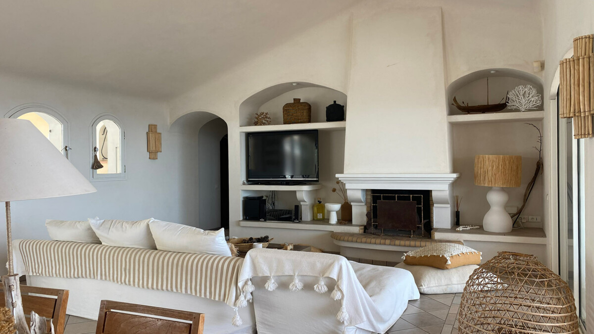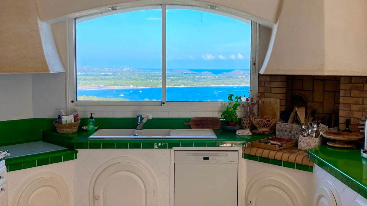 Le salon est central et baigné de lumière par une baie vitrée à multiples vantaux avec une pleine vue sur la mer et un accès direct à la piscine. Une grande cuisine s’ouvre sur un coin repas particulièrement agréable et bénéficie d’une très belle vue sur la mer et la piscine.