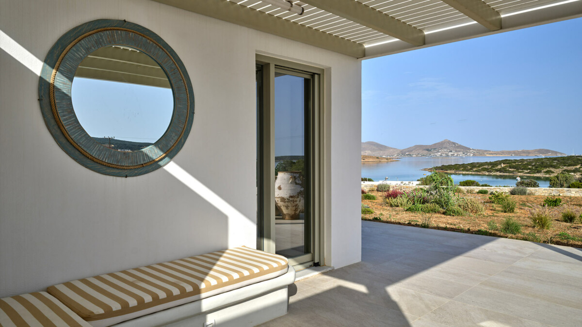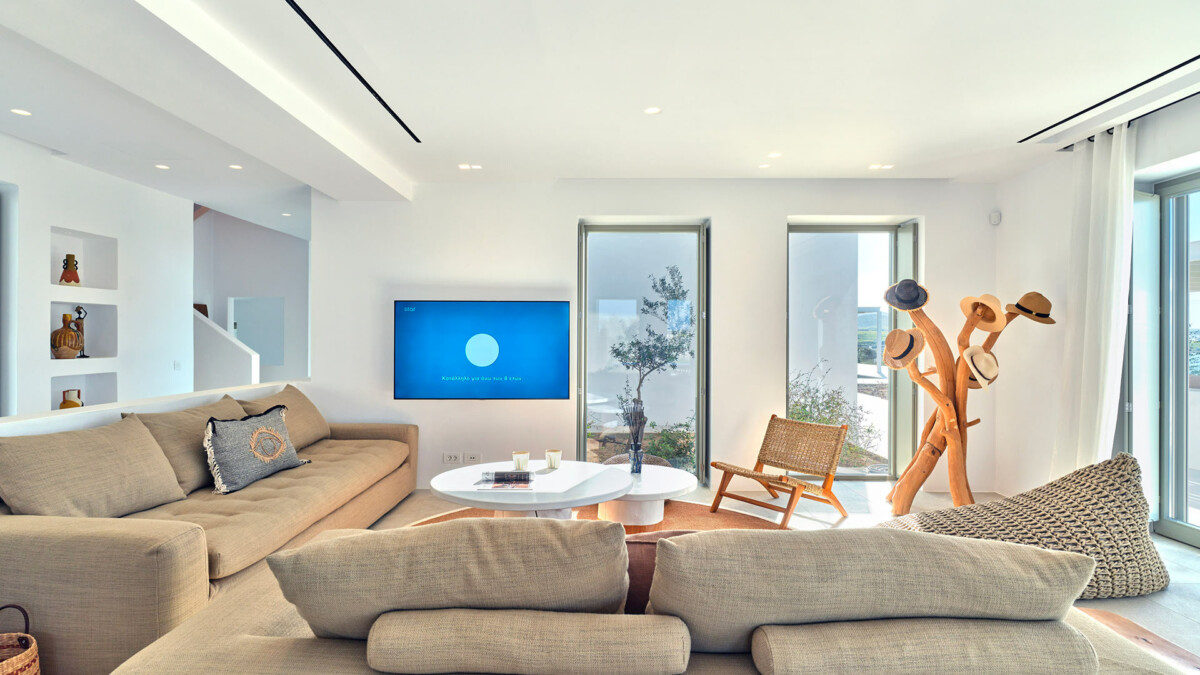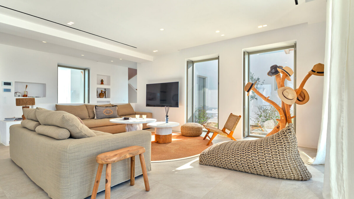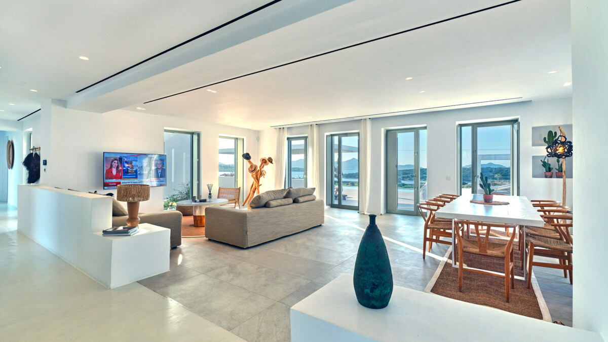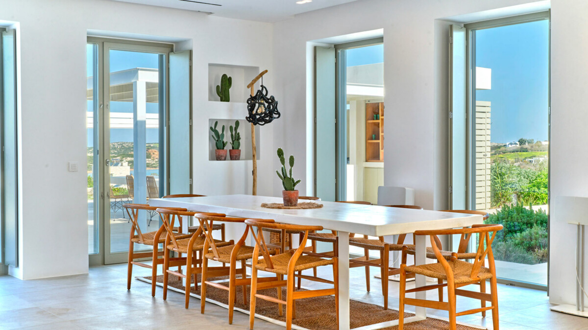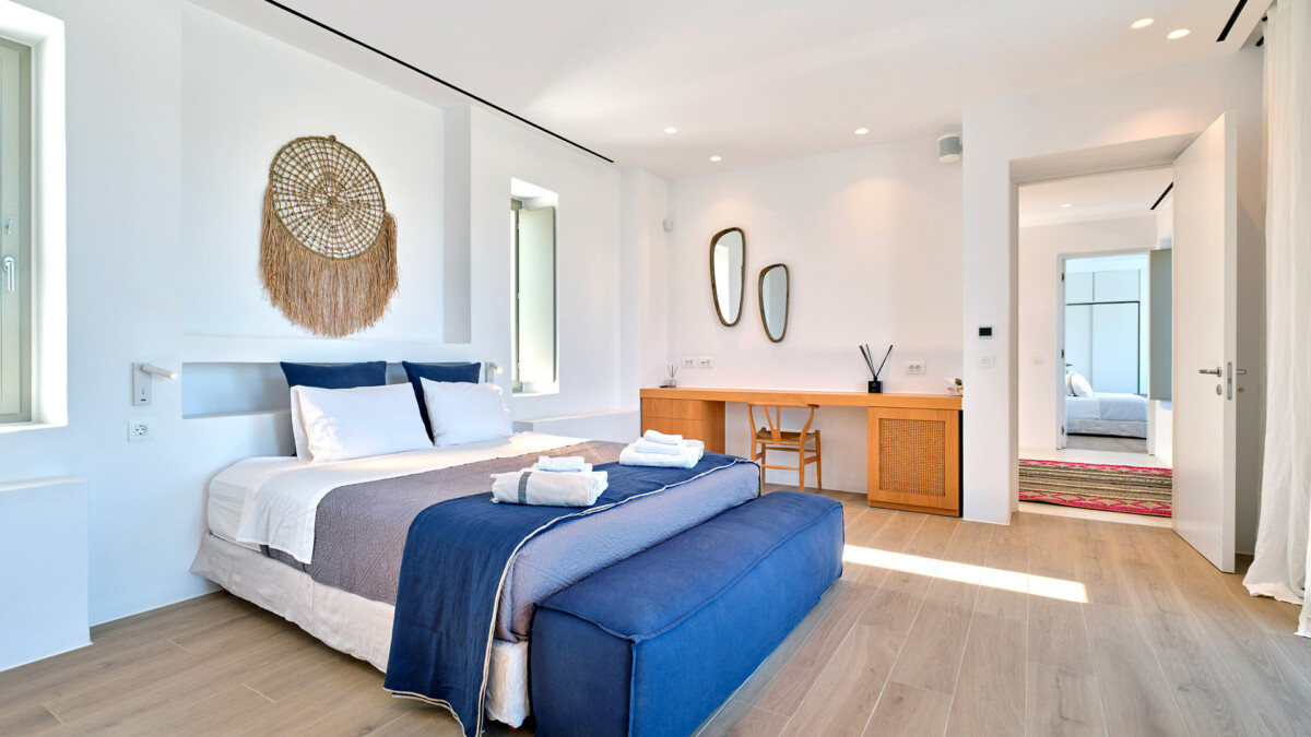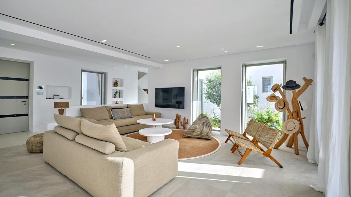 La villa dispose d’un style minimaliste et moderne, avec des lignes simples et des formations cubiques qui révèlent son origine cycladique. A l’intérieur, les espaces sont spacieux et baignés de lumière naturelle. Décorés dans des tons blancs et beige, avec des sols carrelés et des salles de bains en marbre, les intérieurs de la villa dégagent un sentiment de pureté et de liberté qui revigorera votre corps et votre esprit.