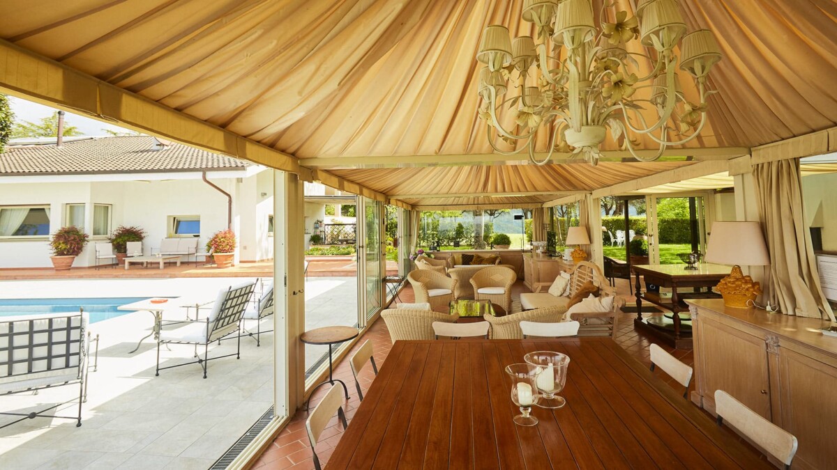 Le Gazebo, structure entièrement en verre et rideaux, élégant et raffiné avec des canapés et des chaises pour une détente complète de la piscine. Dans le gazebo, vous pourrez profiter d’une cheminée à bois, d’un four à pizza au bois, d’un grand réfrigérateur et d’une table en bois avec des chaises pour 12 personnes. Le Gazebo mène à la grande piscine d’eau salée avec des chaises longues, au bain à remous avec 5 sièges et l’eau chauffée, à la douche extérieure et à une autre salle de bains avec douche.