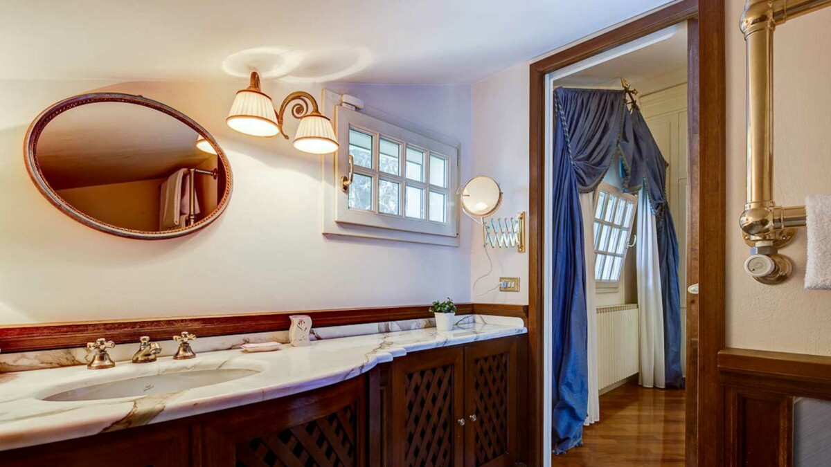 A l’intérieur, il a toutes les commodités dans de grands espaces lumineux: salle de séjour avec de grands canapés, salle à manger avec grande table dans le style du XXe siècle et fenêtres panoramiques, cuisine professionnelle entièrement équipée et une véranda donnant sur le parc, buanderie complète, salle de loisirs avec bibliothèque, jeux de table, flipper 80s, pc et un billard merveilleux dans le style du XIXe siècle.