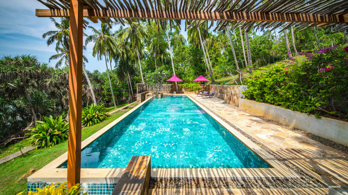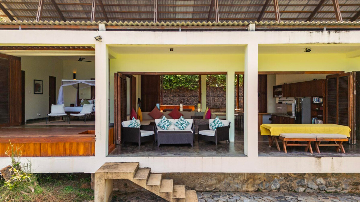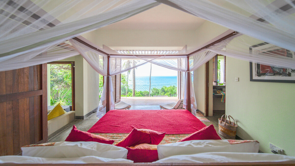La villa dispose de 3 chambres, chacune donnant sur le jardin et l’océan. Chaque chambre est double avec un lit à baldaquin et un jardin terrasse. Le salon est ouvert sur les deux côtés afin de profiter de la vue et de la brise de mer. Des canapés profonds occupent le salon.