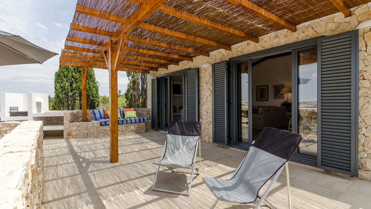Le salon ouvert avec table à manger et cuisine mène à une terrasse à travers des portes vitrées. Le salon dispose d’une belle cheminée, et la propriété dispose de la climatisation pour les jours les plus chauds.