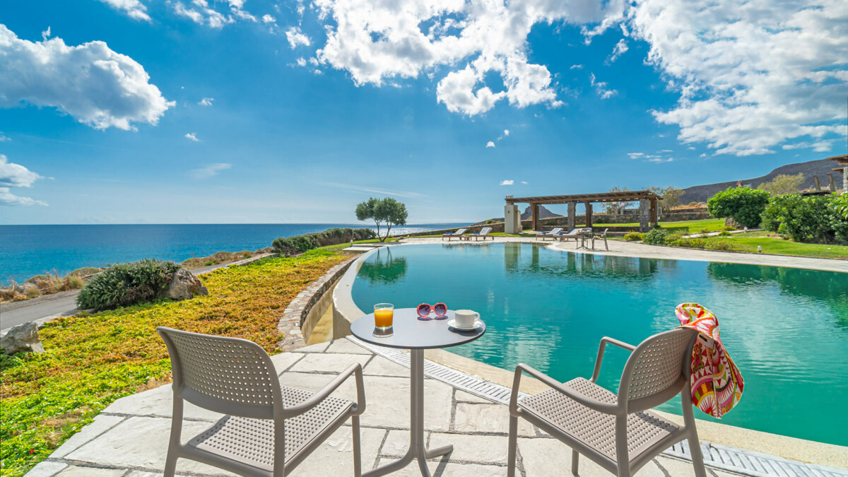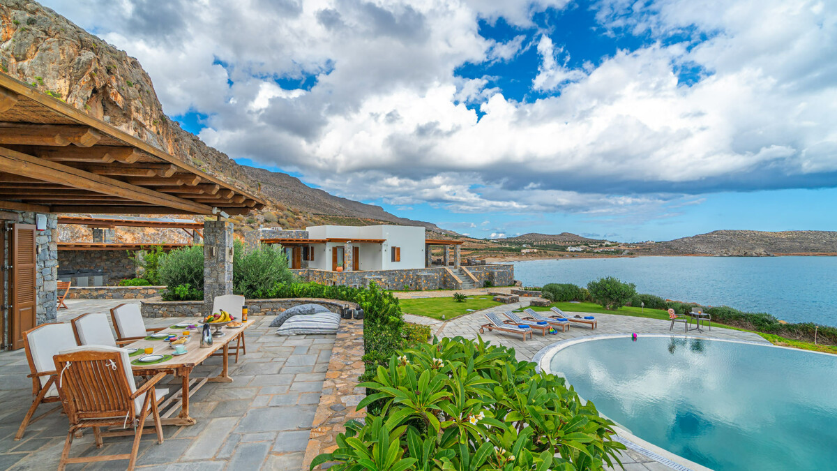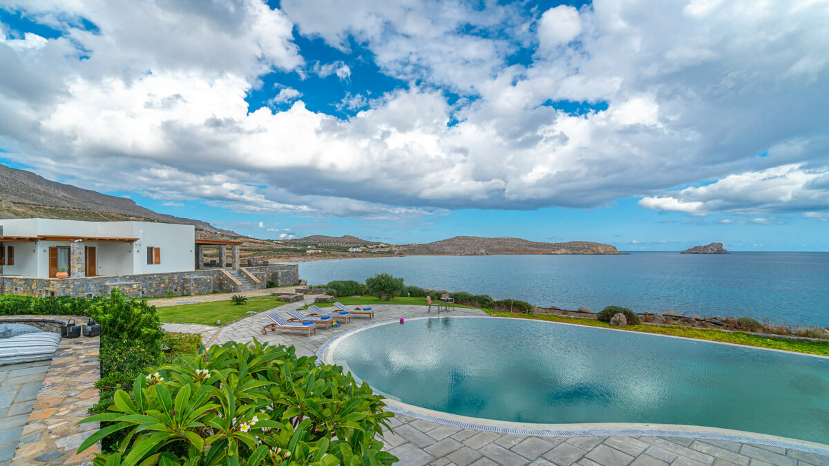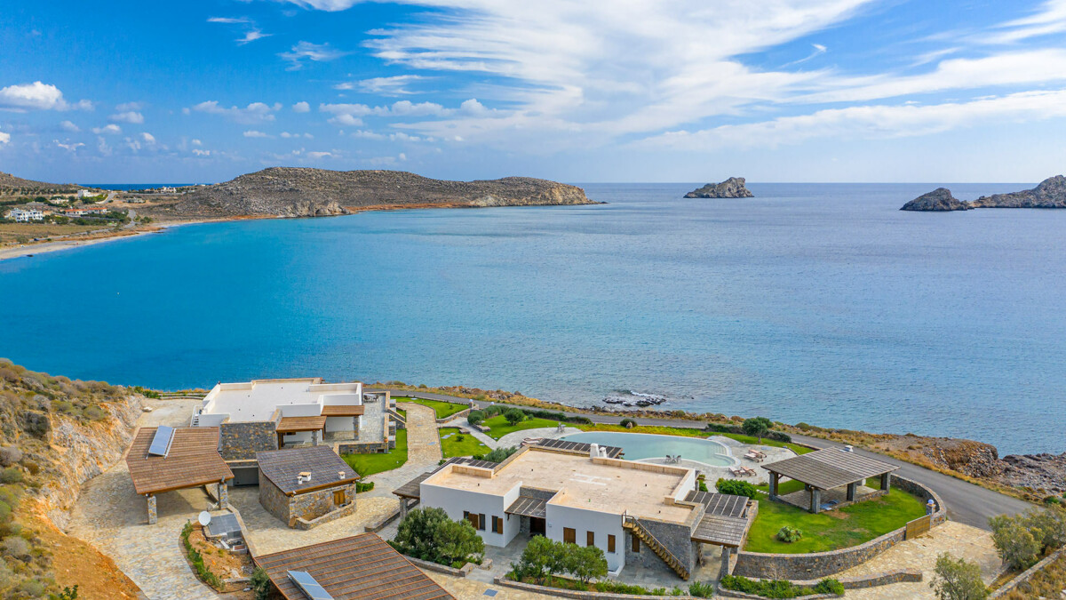 Villa moderne avec 6 chambres doubles et 6 salles de bains située dans une zone très privée avec vue sur la mer et les grottes à Sitia, Crète.