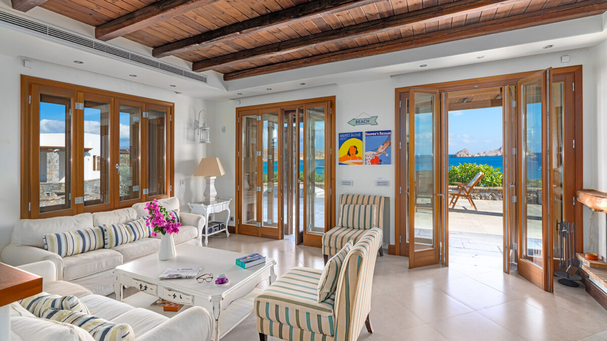 Salon spacieux avec canapés, canapé-lit, A / C, TV, système de son, cheminée, vue sur la piscine