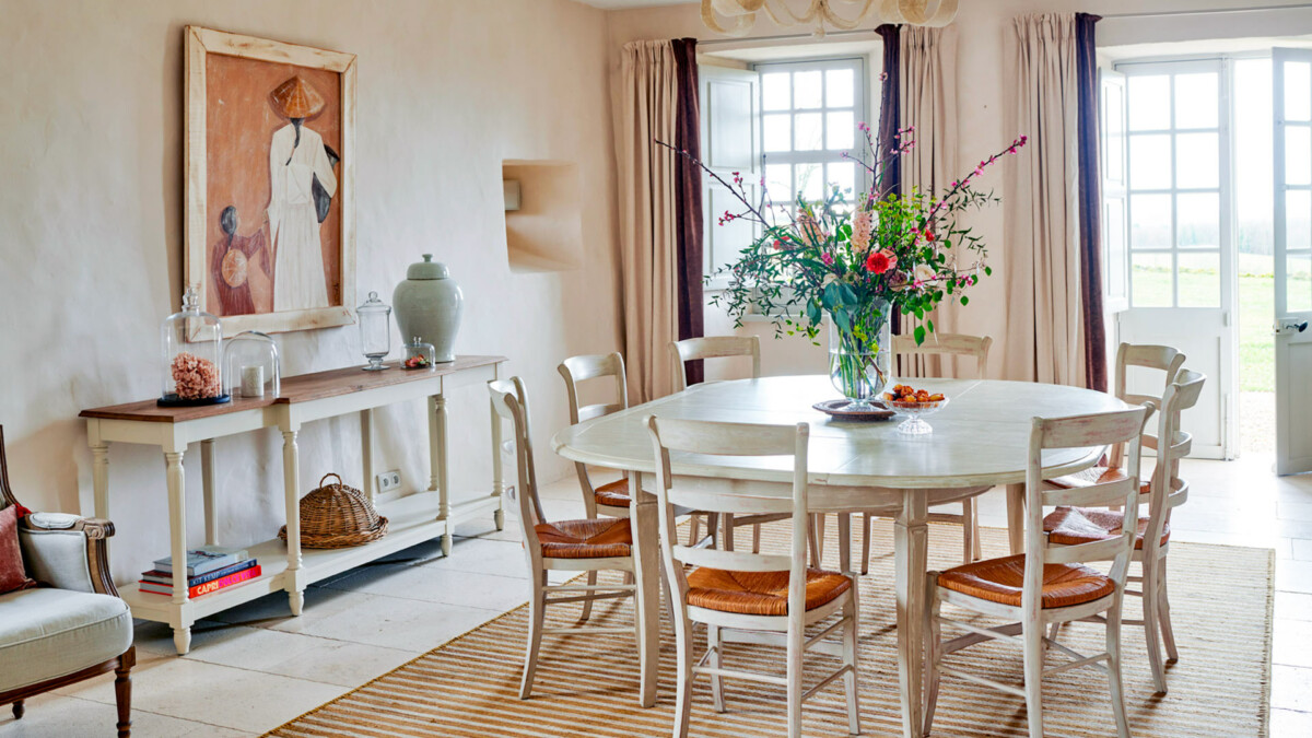 La décoration élégante et raffinée, les matériaux et les couleurs choisis procurent à la maison une atmosphère paisible avec une vue reposante sur un paysage bucolique.