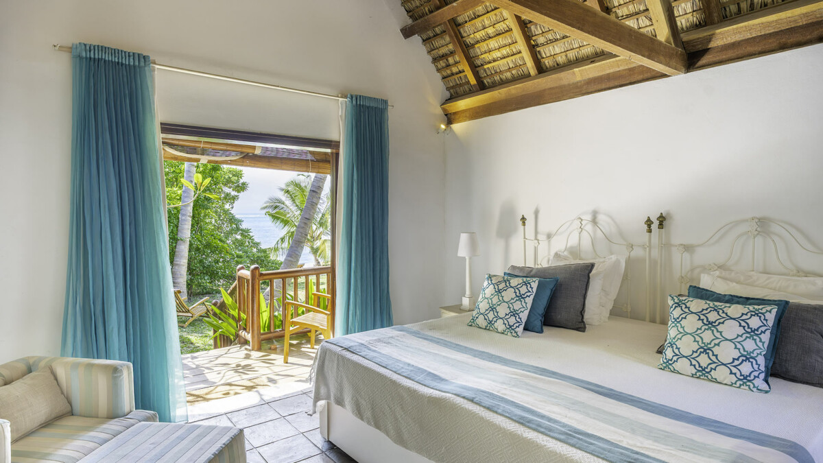 Chambre, De plain-pied, vue sur la mer. La chambre propose 1 lit double 200 cm. Salle de bain attenante, privée, avec douche. WC dans la salle de bain, WC séparés. La chambre inclut également : climatisation, coffre fort.