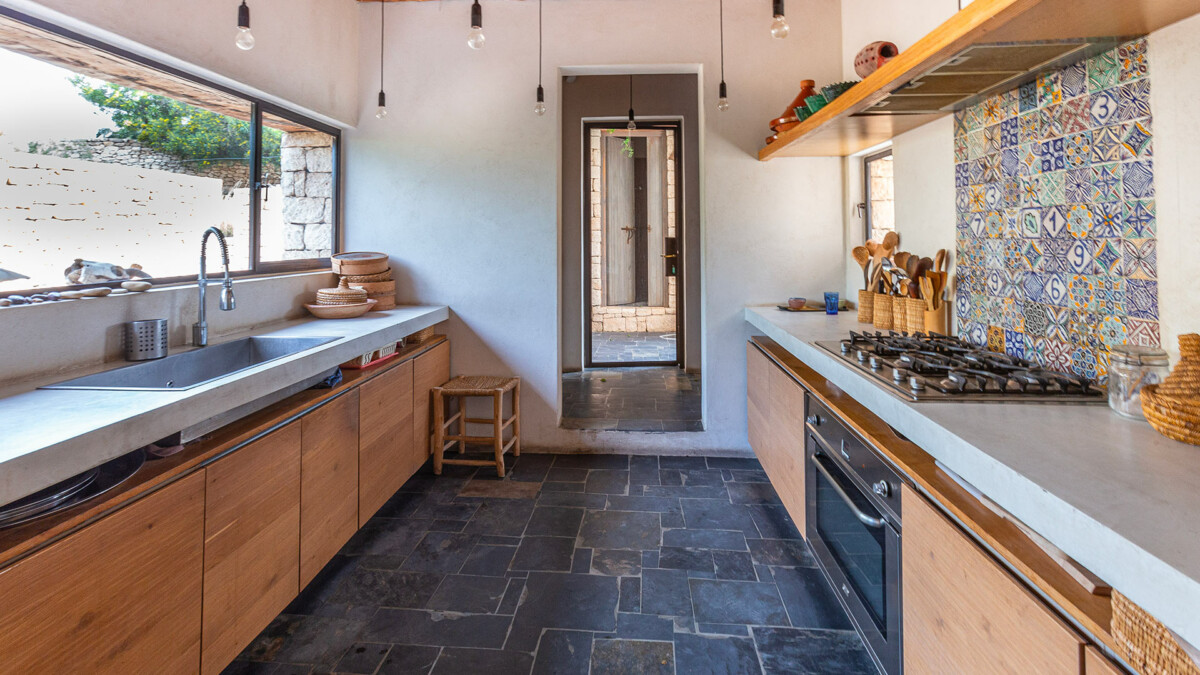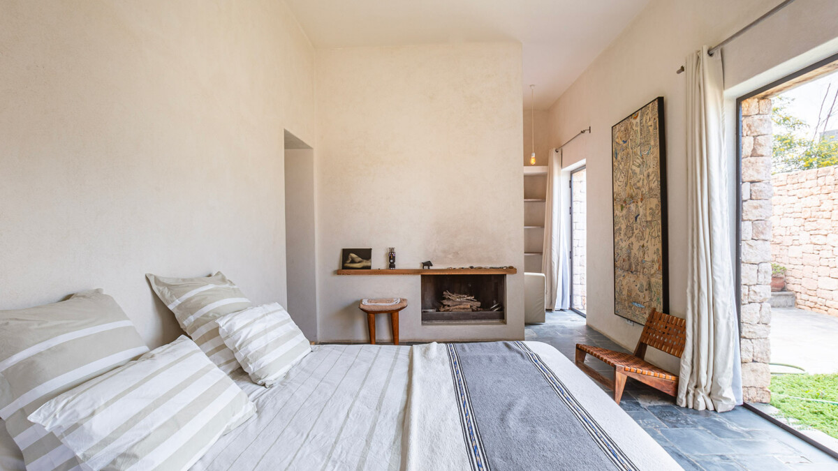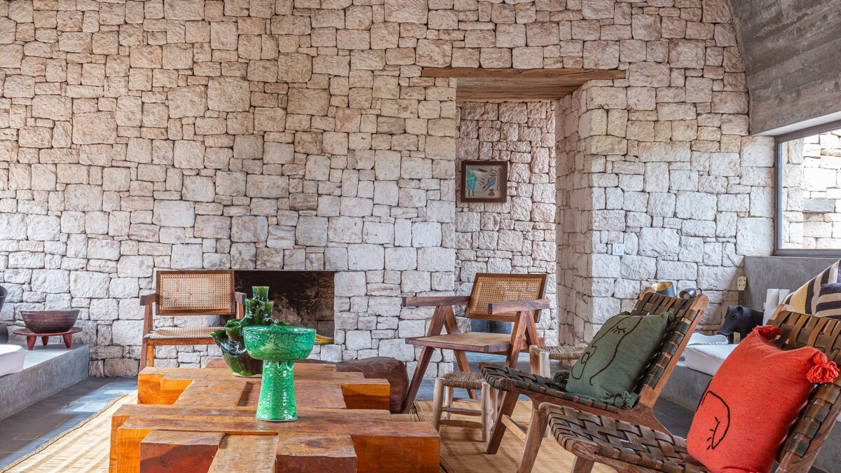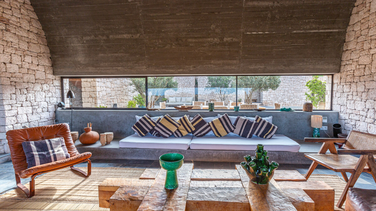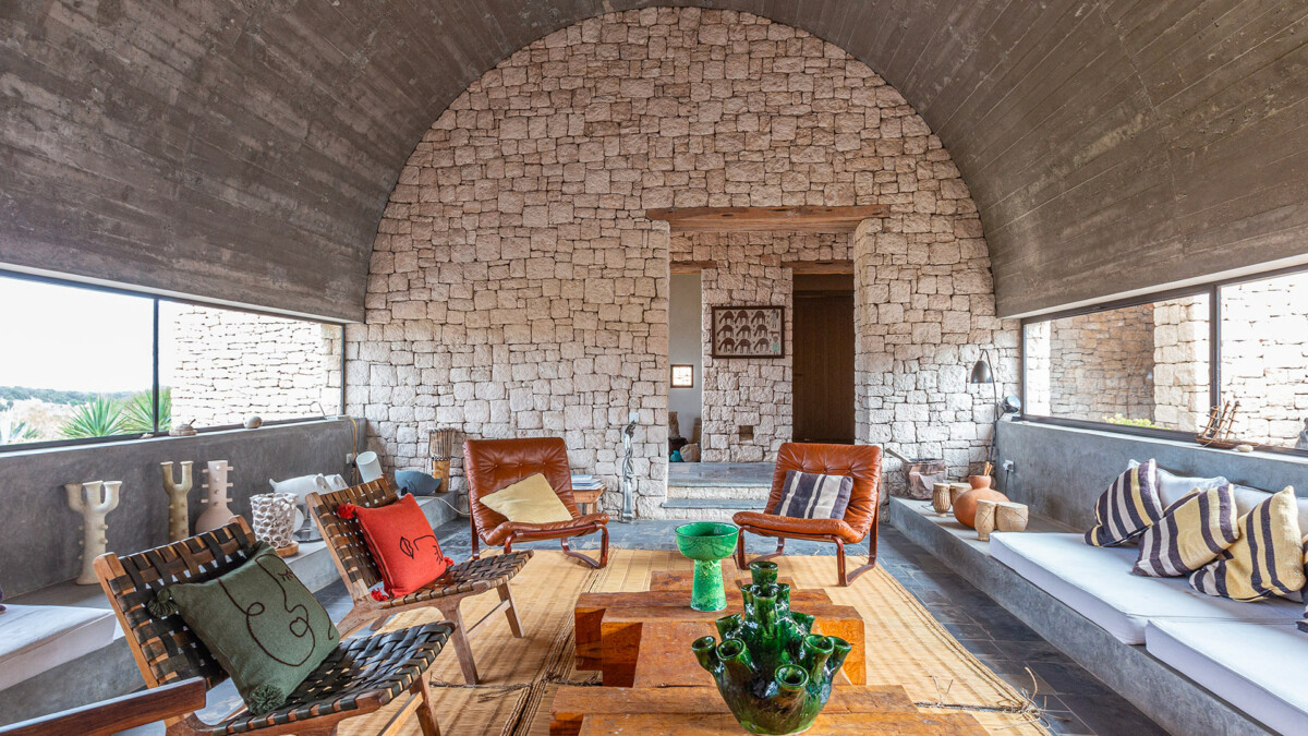 L’intérieur de la propriété est un mélange subtil d’architecture traditionnelle et de minimalisme contemporain. Il comprend un salon vouté en béton, qui sert d’espace pour le repos, la lecture, la musique et les discutions.