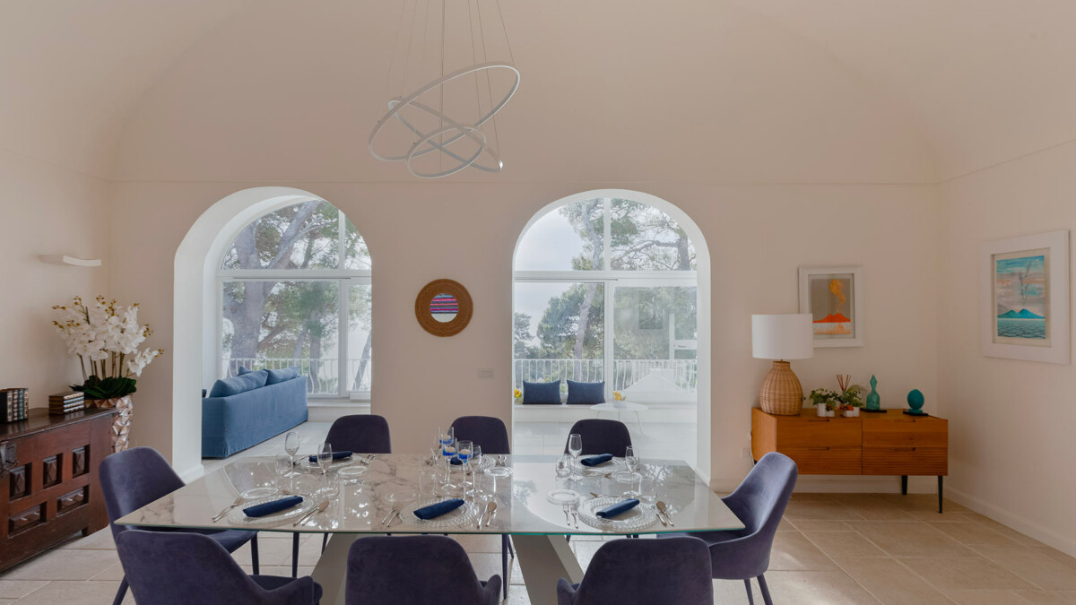 Ils pourront également profiter de la grande salle à manger de plein air avec point de vue exceptionnel pour le coucher du soleil, des grandes terrasses ensoleillées et de la piscine (avec plongeoir, chaises longues et vue sur Capri).