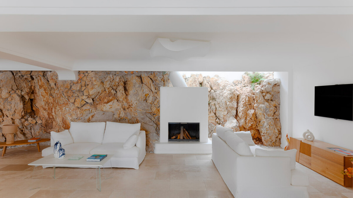 Un étage entier est consacré à la chambre principale. Cet espace a été construit directement dans la roche volcanique, créant une ambiance détendue et fraîche. Ce niveau comporte de grandes ouvertures, une cheminée, un dressing, une salle de bain privative, ainsi qu’un grand espace de vie avec des canapés design et une télévision grand écran.
