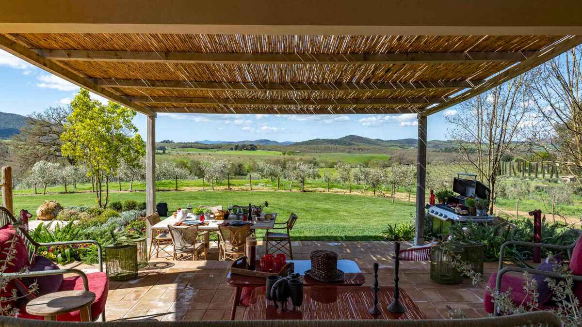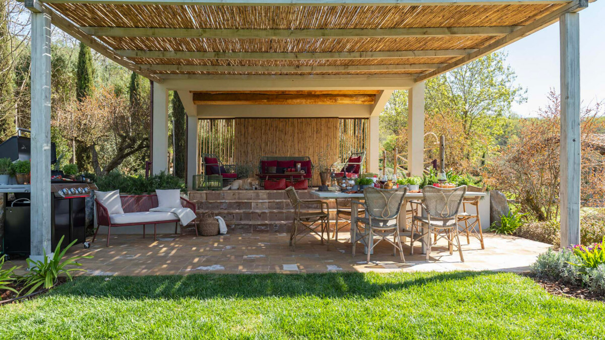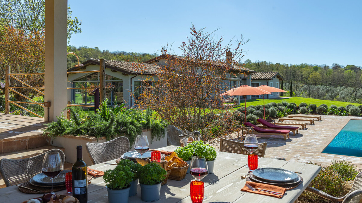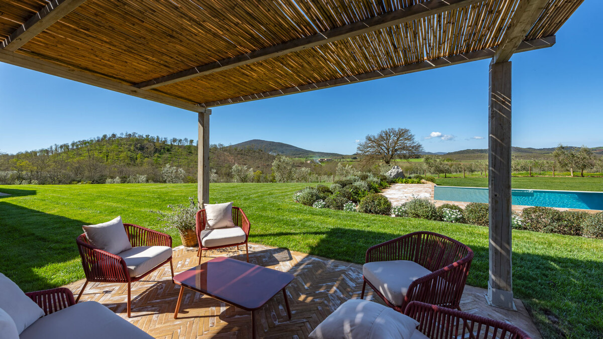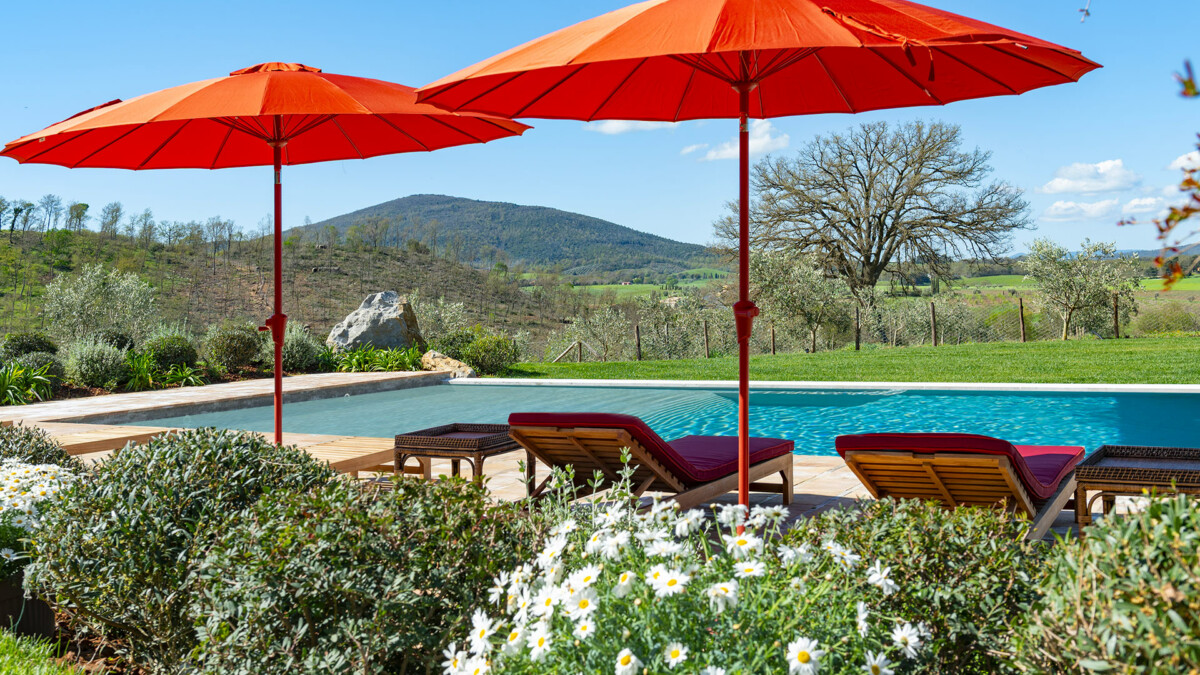 À l’extérieur, un vaste jardin soigneusement entretenu alterne pelouses, essences locales et espaces dédiés à la détente. La piscine (de 14 × 7 m – profondeur constante de 1,5 m), invite à la baignade et à la détente sous le soleil toscan. Autour du bassin, transats et coins d’ombre offrent une vue dégagée sur la campagne environnante. Une terrasse couverte est aménagée pour des repas en plein air et des moments de partage. Un parking couvert pour 4 voitures, équipé d’une borne de recharge pour véhicules électriques, complète l’ensemble pour plus de praticité.